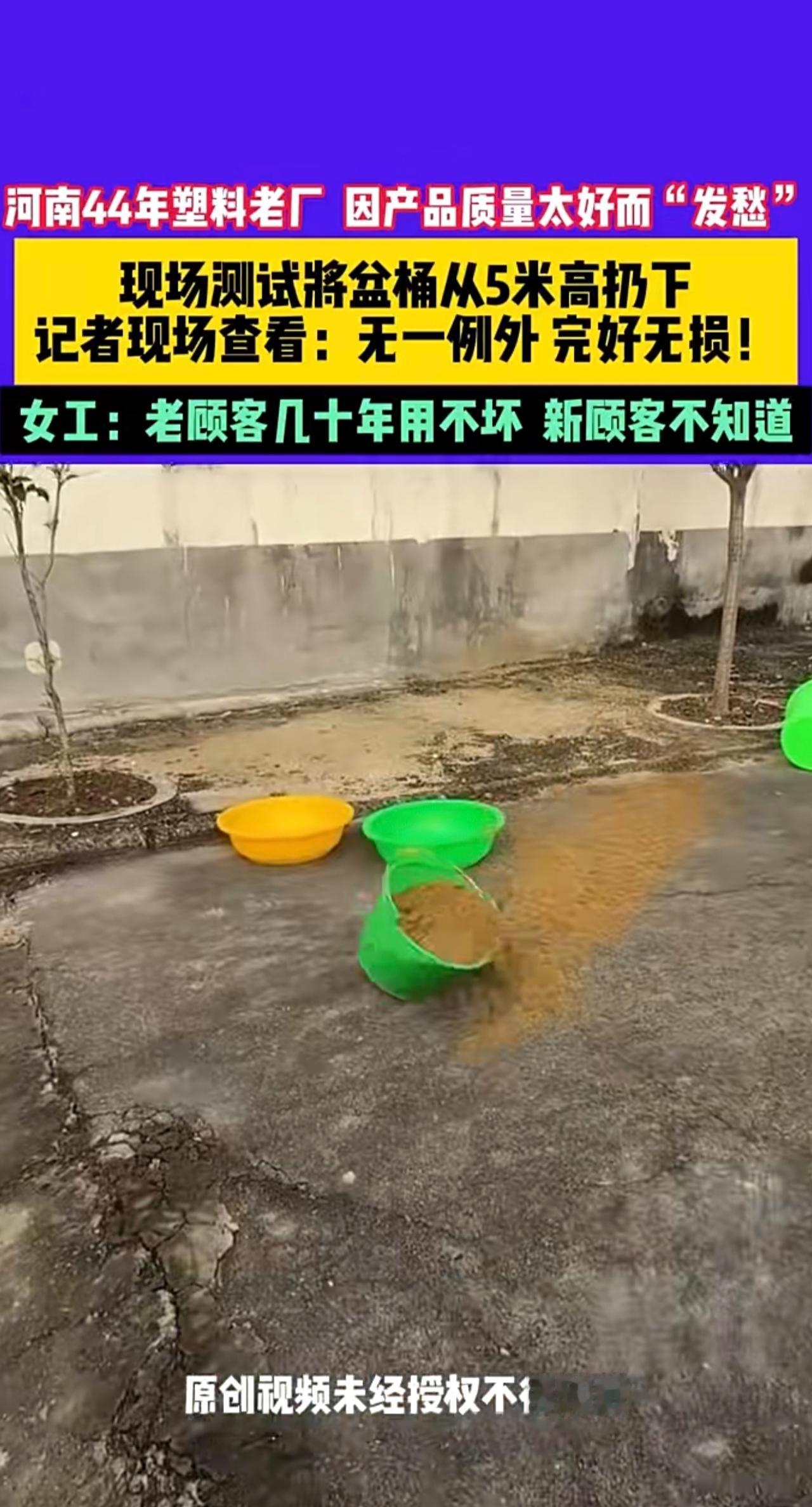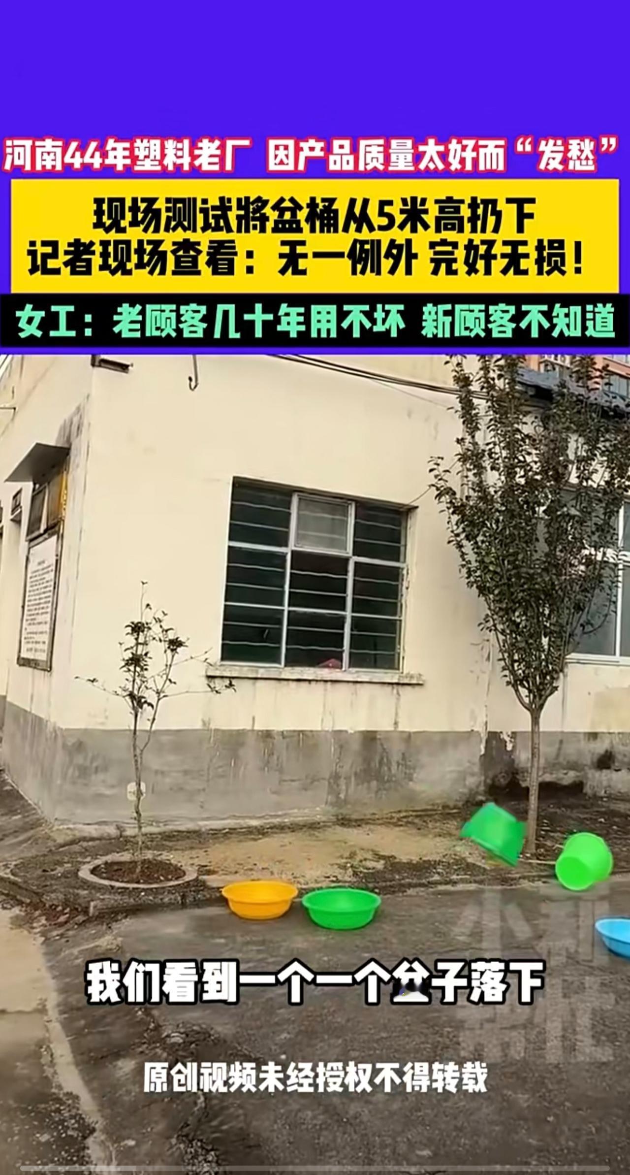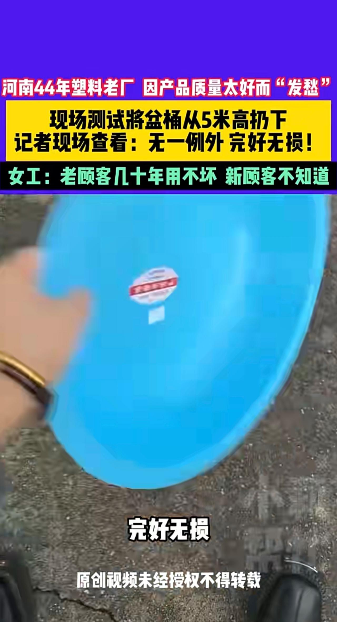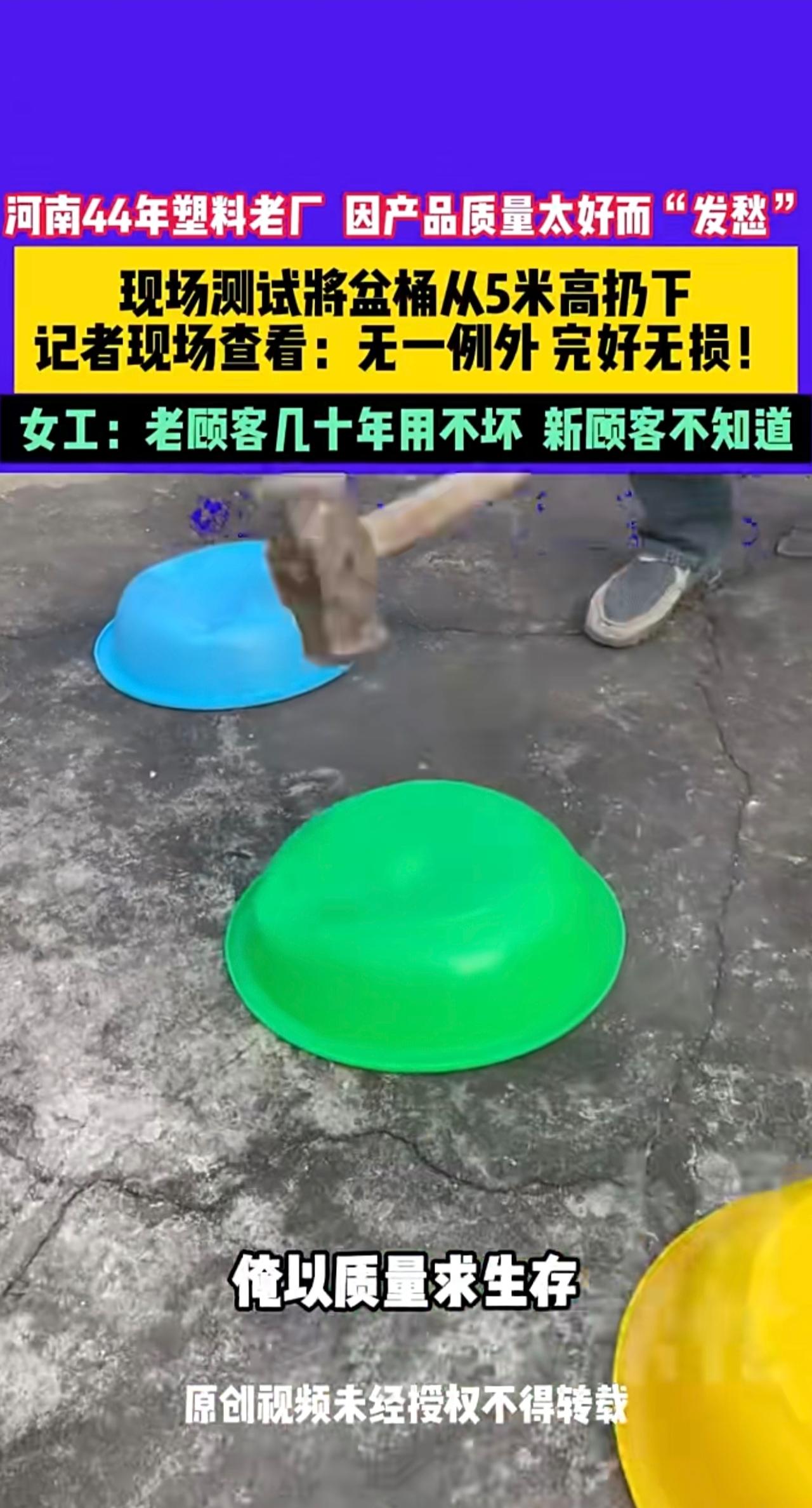 10月29日(发布)河南郑州 河南44年塑料老厂 因产品质量太好而“发愁”。现场测试将盆桶从5米高扔下 记者现场查看:无一例外 完好无损。