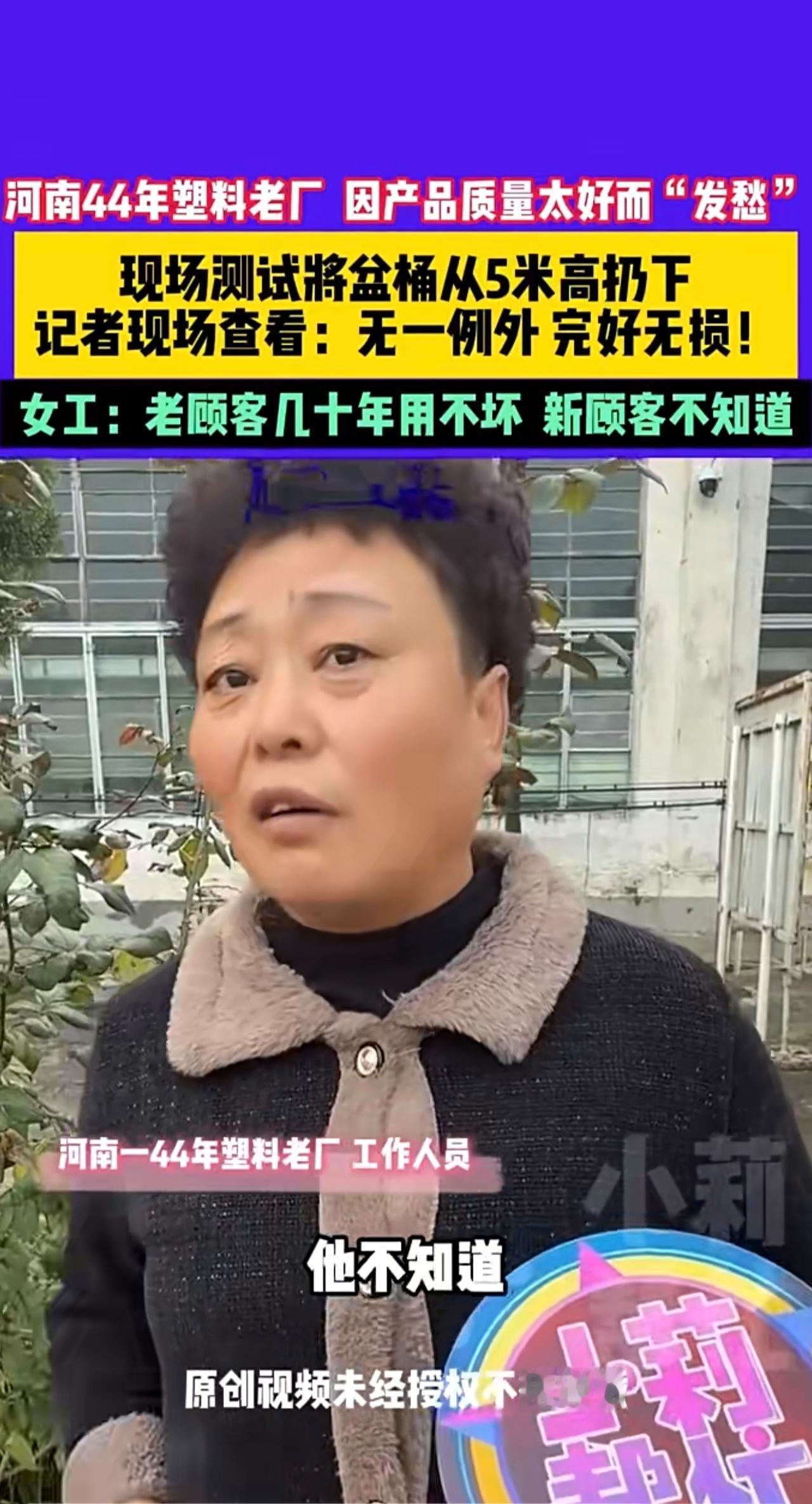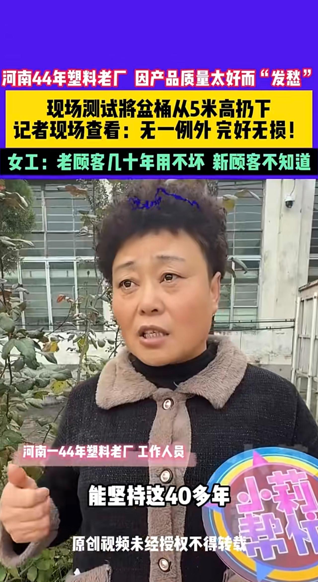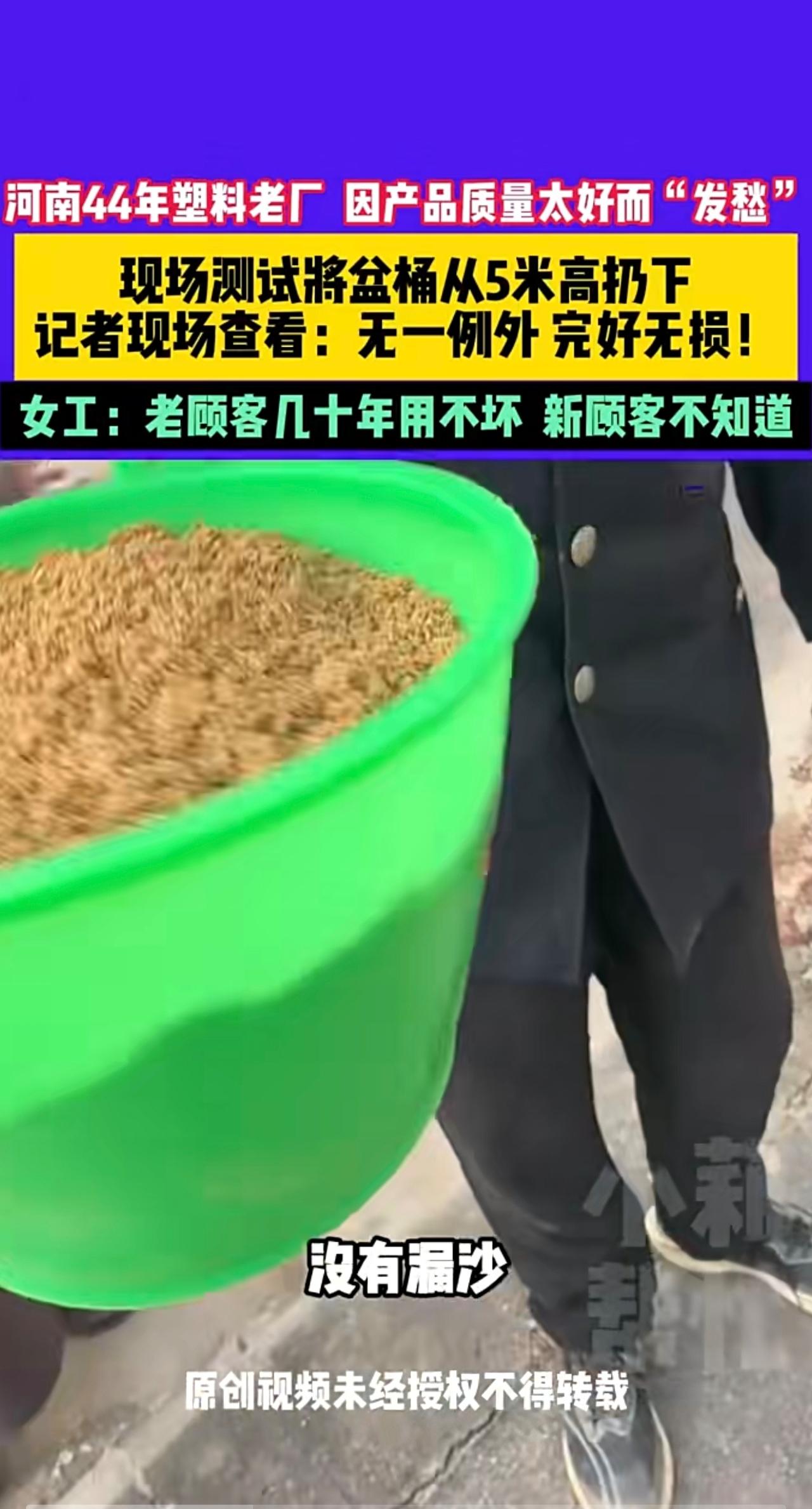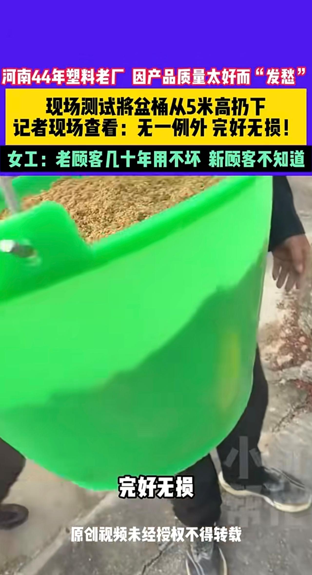 10月29日(发布)河南郑州 河南44年塑料老厂 因产品质量太好而“发愁”。现场测试将盆桶从5米高扔下 记者现场查看:无一例外 完好无损。