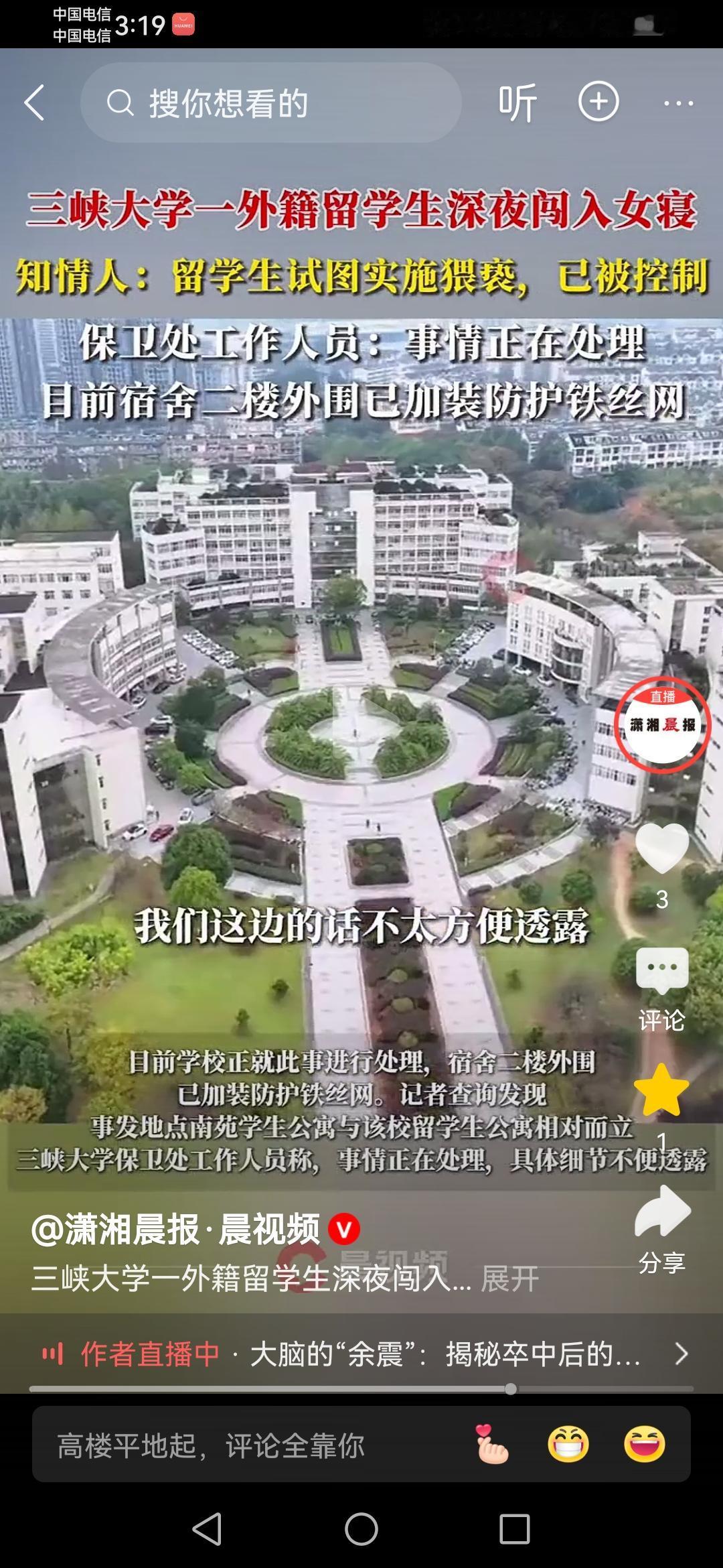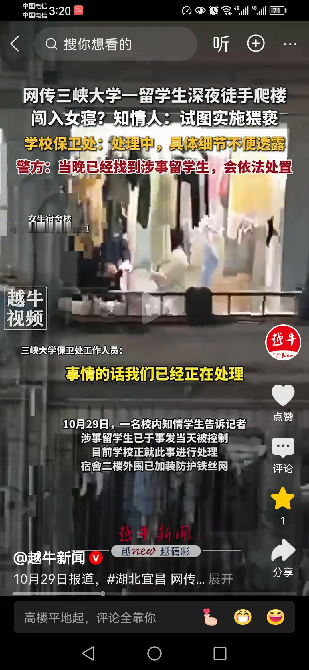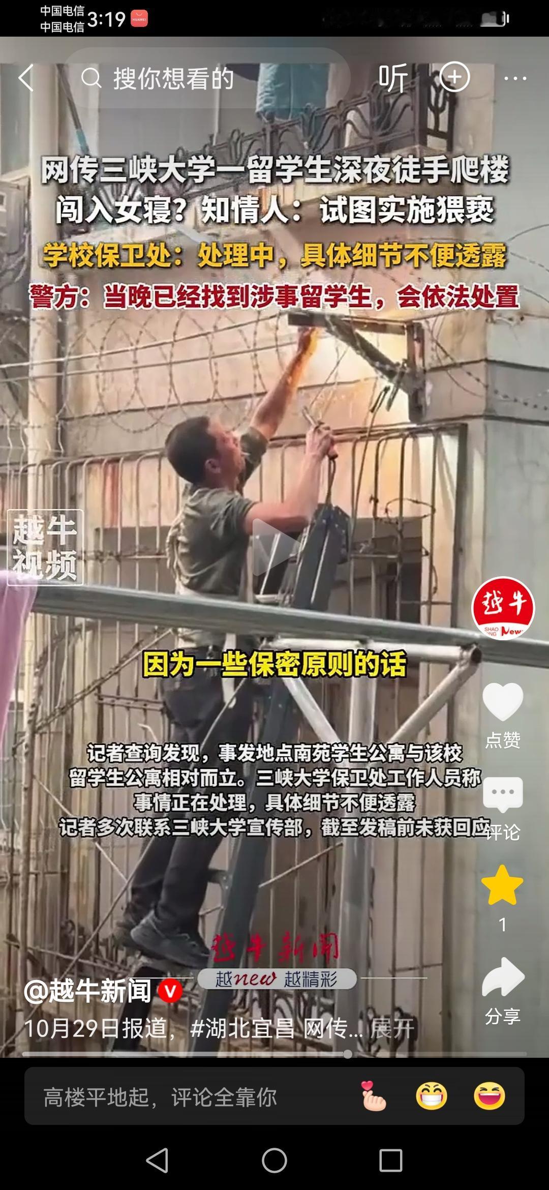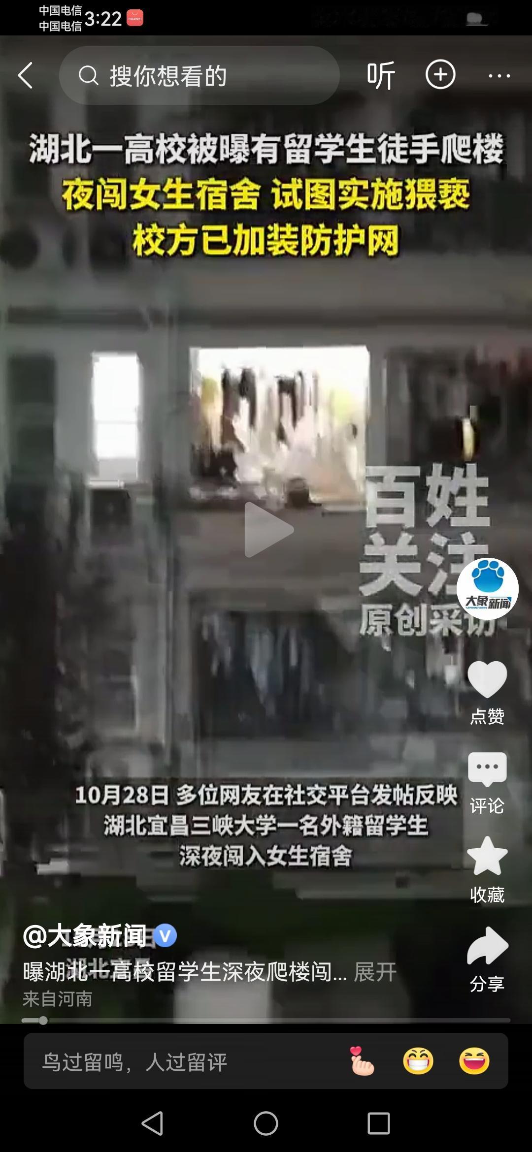 网传湖北有一所大学发生半夜有外籍留学生,爬上女生宿舍的二楼,意图进行猥亵的行为。还能再离谱一点吗? 据说事情发生在10月28号半夜,以为黑人外籍留学生直接是闯入了女生宿舍,后来被发现以后,慌忙逃走。在事情发生的当晚,这位留学生就已经被控制。 目前涉事的学生已经针对女生宿舍的二楼加装了防护铁丝网,对于此事,学校方面回应涉及到保密规定,不方便透露。 这个事情,我们必须要足够的重视,这次可是直接闯进了女生宿舍进行图谋不轨,已经是违法的行为,针对这样的人不止要劝退,还要追究他的法律责任才可以!