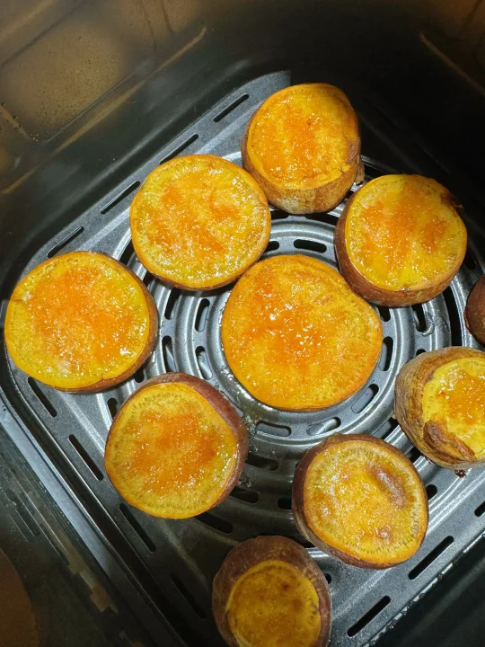 最近一直刷到这个“烤红薯”,今天忍不住试了,真心好吃! 我用的烟薯,烤好后外皮烤干了一口下去外面是带点嚼劲的,里头是软软糯糯的,我抹了黄油还撒了点白糖,黄油香夹杂点白糖的焦糖香,我妈让我明天继续烤…… 家里有烤箱有空气炸锅的姐妹都可以试试,不会后悔的那种追剧小零食! 首先准备一个“空气炸锅” 1、烟薯切成厚片一指宽 2、平铺进空气炸锅180度烤15-18分钟 3、拿出来泡水2分钟 4、翻面抹上黄油撒上白糖(不放也行)继续180度烤15-18分钟 5、开吃