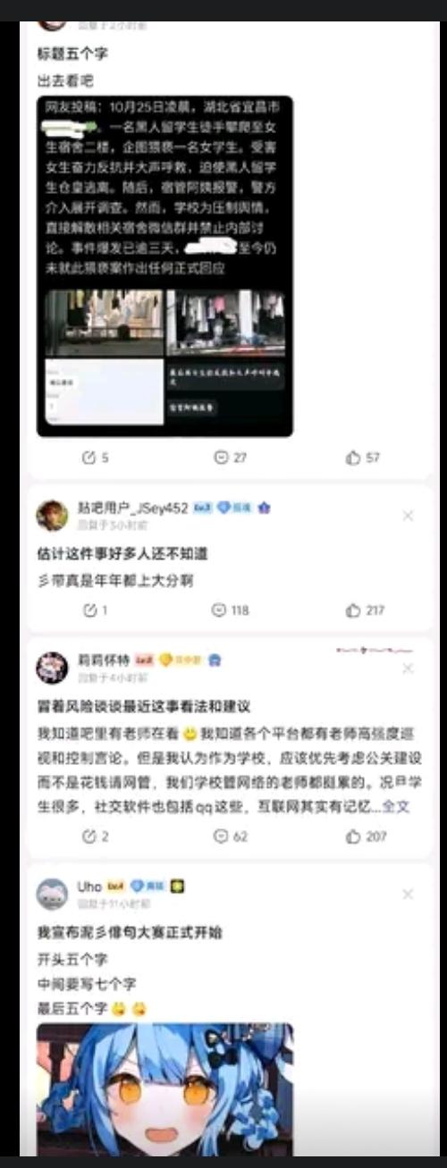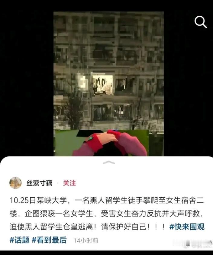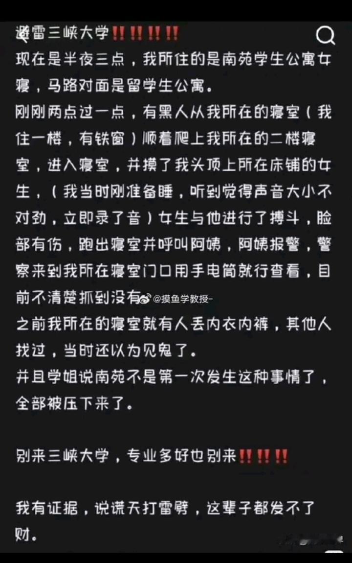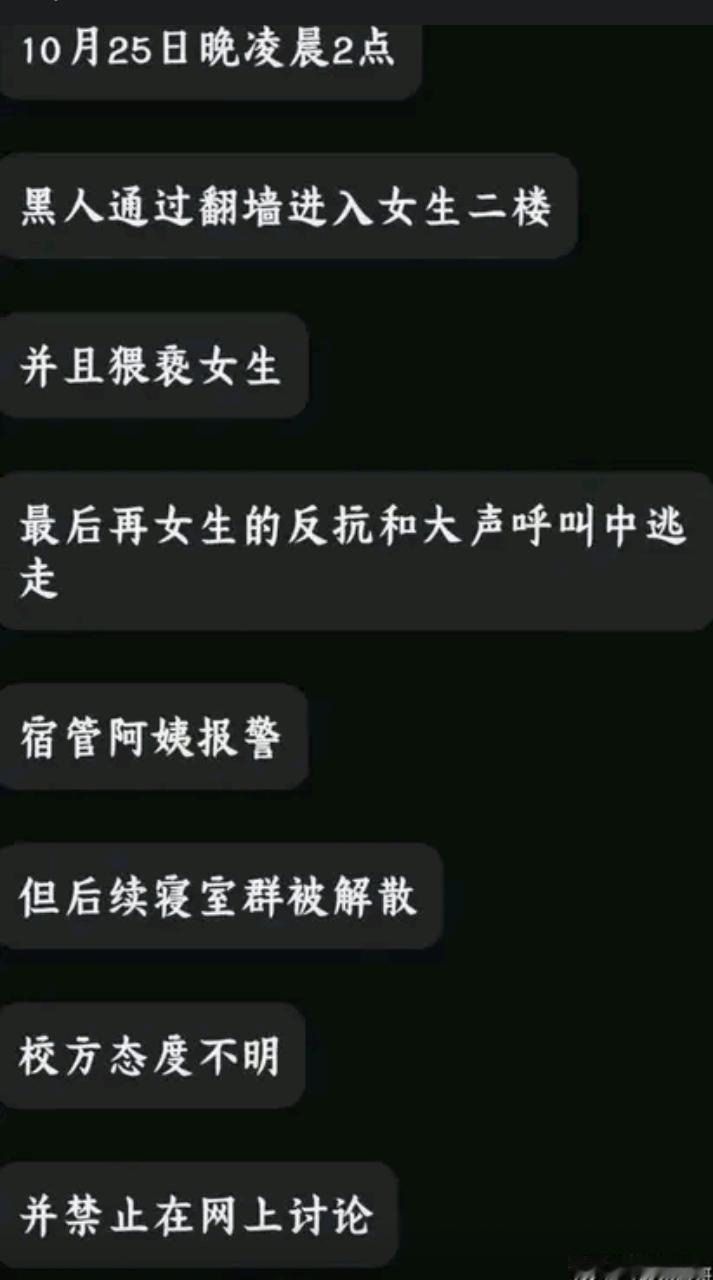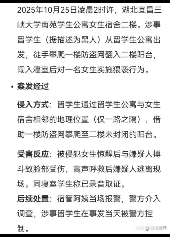 10月25日凌晨,三峡大学一名非洲留学生,大半夜闯入女生宿舍意图不轨。 据说,该校非洲留学生夜闯女生宿舍,已经不是第一次了。 虽说学校在女生宿舍四周装上了隔离护栏,但也保不住还会有登徒子之流硬闯。 怪不得现在许多家长不让自己的子女报考外国留学生占比例较高的学校,家长的担忧是有道理的。 许多留学生,尤其是非洲留学生,他们来我们这儿,与其说是求学,还不如说他们是别有目的的。