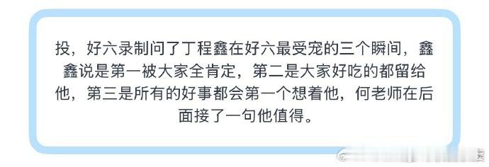 丁程鑫在好六最受宠的三个瞬间何老师说丁程鑫值得丁程鑫《你好星期六》说受宠瞬间:全员肯定、留美食、好事先记着,何炅夸 “他值得”。