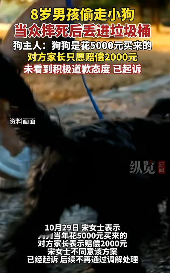 这种家庭真是坏种!近日,浙江温州,女子带着狗狗出门遛弯,没想到狗狗被男孩偷走,而偷狗的男孩竟将狗狗带去游乐场将狗摔死,事后女子要赔偿,没想到男孩的家庭更坏。网友:这种家庭很可怕。 男孩把狗带去了游乐场,当着其他小朋友的面把狗狗摔死,随后扔进了垃圾桶中,女子发现狗狗不见后,找物业要到了监控,才发现狗狗早就被偷走了。 女子找到了男孩后发现,男孩只有8岁,只能找男孩家长要赔偿,当时狗狗是花五千块钱买的,要对方也赔五千块钱,没想到男孩家长更蛮不讲理,没意识自己孩子做了多大的错事,只愿意陪给女子2000块钱,女子只能起诉。 有网友评论说,将来孩子是否有正确的价值观,都是父母一手造成的。 网友的话说的很对,8岁的男孩之所以会做出这种事,最根源的就是有一个不讲理的家长,家长都不知道什么是对的,又怎么可能把孩子教好。 8岁的孩子正应该是享受世界美好的时候,可现在却背上了一条鲜活的生命,如果没能及时纠正,未来真不敢想。 素材来源:纵览新闻