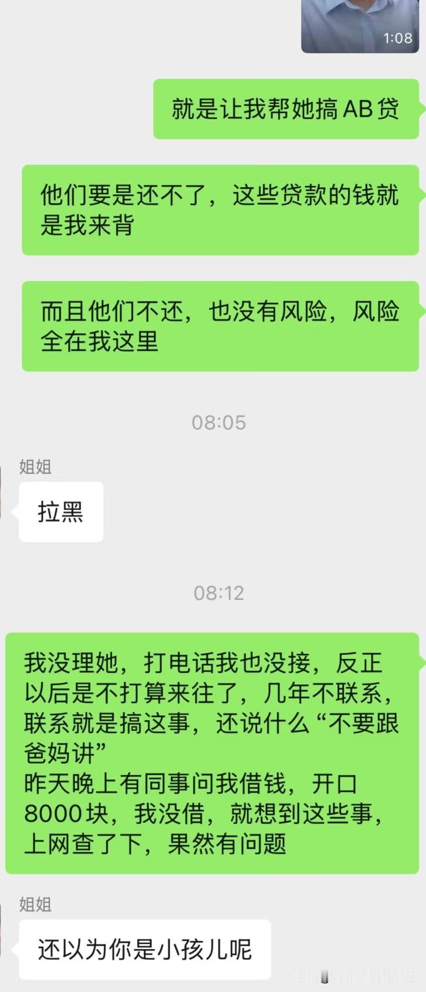 多年不联系的表姐突然嘘寒问暖,竟是让我背百万AB贷! 多年不联系的表姐突然热情似火,本以为是亲情升温,结果一开口就是让我帮忙搞“AB贷”,把我当冤大头背锅侠!更绝的是,她还特意叮嘱“别跟爸妈说”,这操作简直把我看得一愣一愣的。 有人骂“这哪是亲戚,分明是吸血鬼”;有人后怕“还好你没上钩,不然哭都没地儿”。 可话说回来,遇到这种“亲情绑架”式的贷款套路,你是会念及旧情心软,还是像博主一样直接拉黑?来聊聊你遇到这种事会咋做!