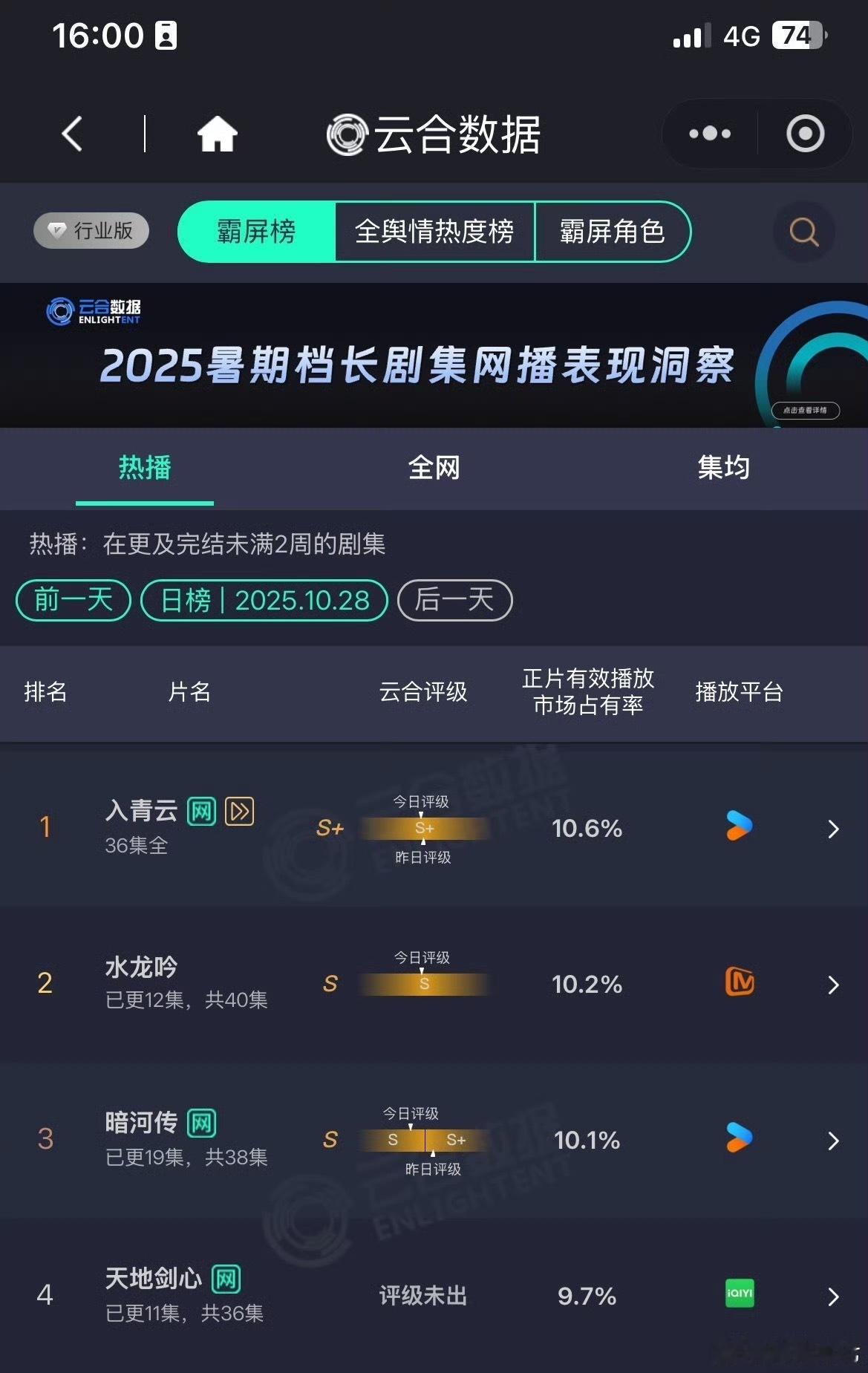 在播古装剧:入青云(已完结),水龙吟,暗河传,天地剑心28号云合数据一览[666]