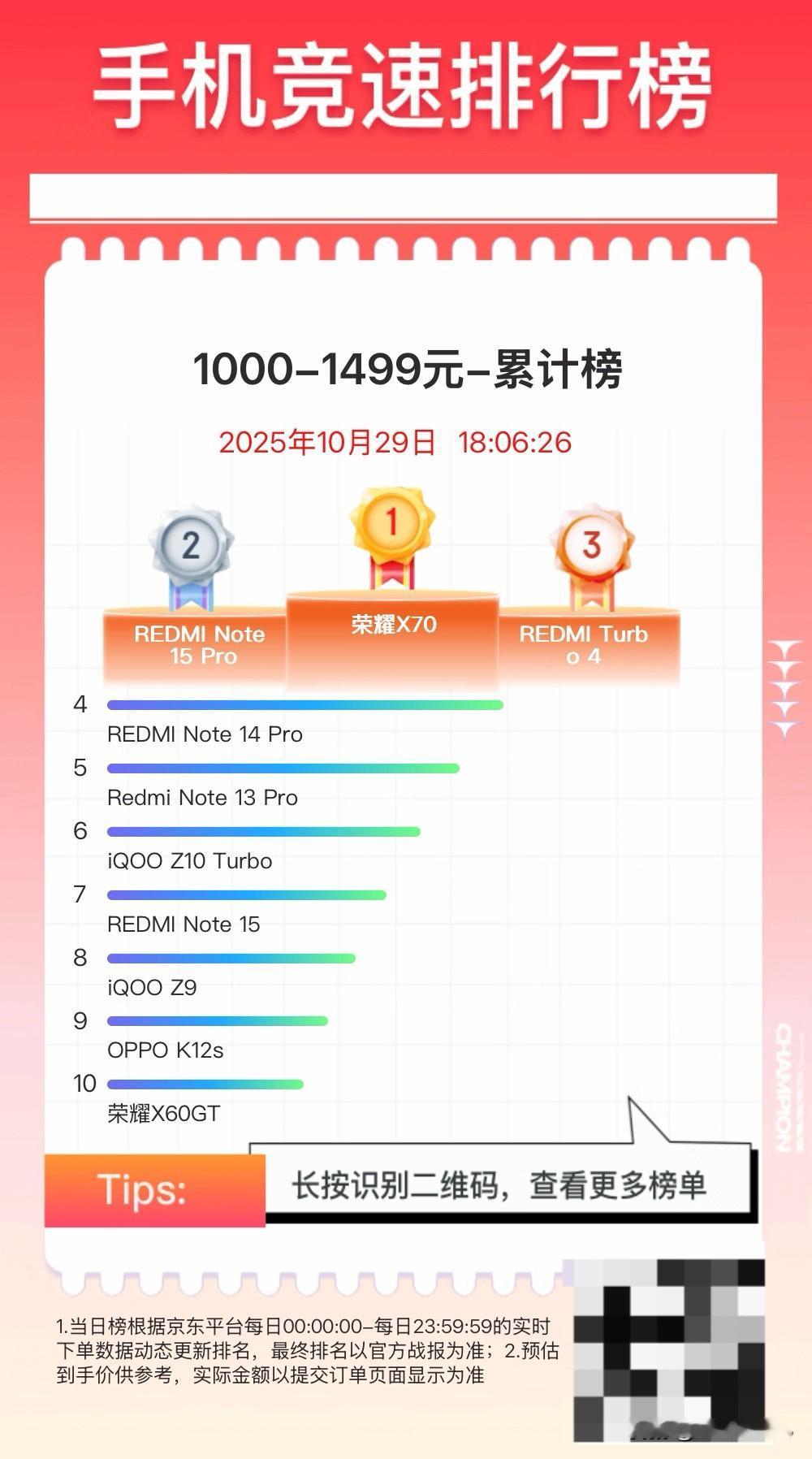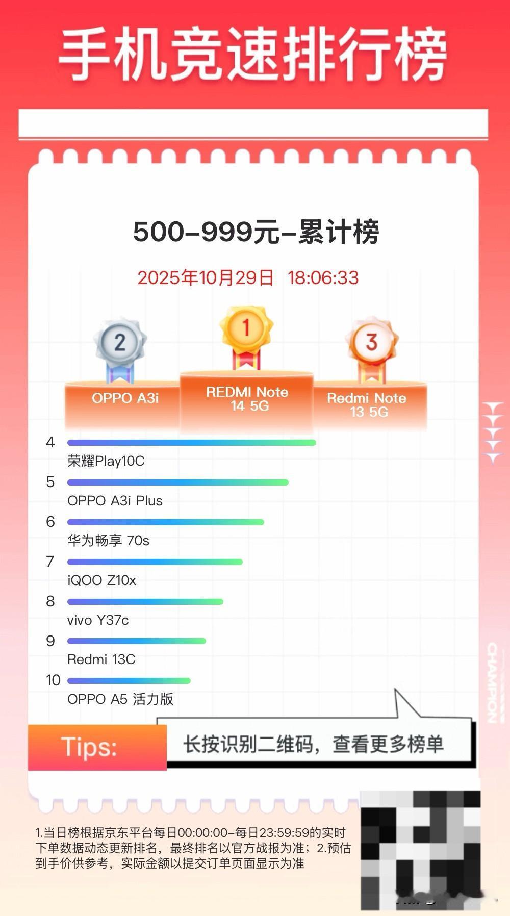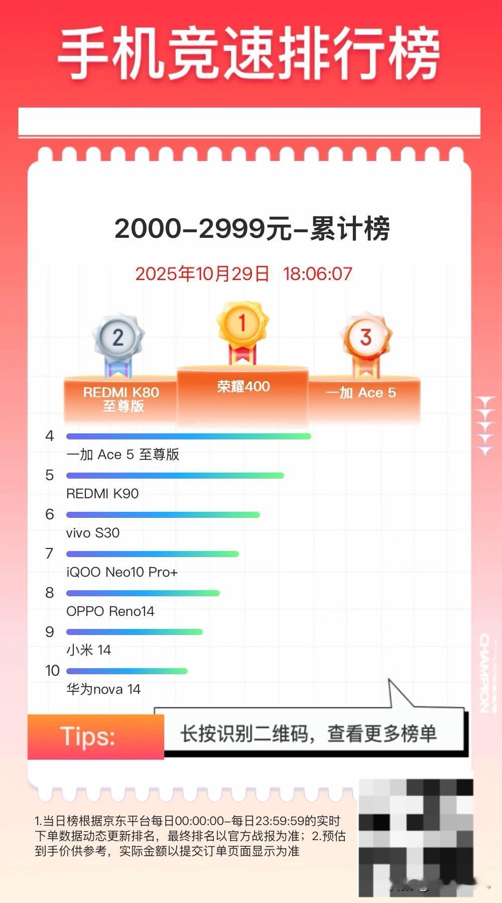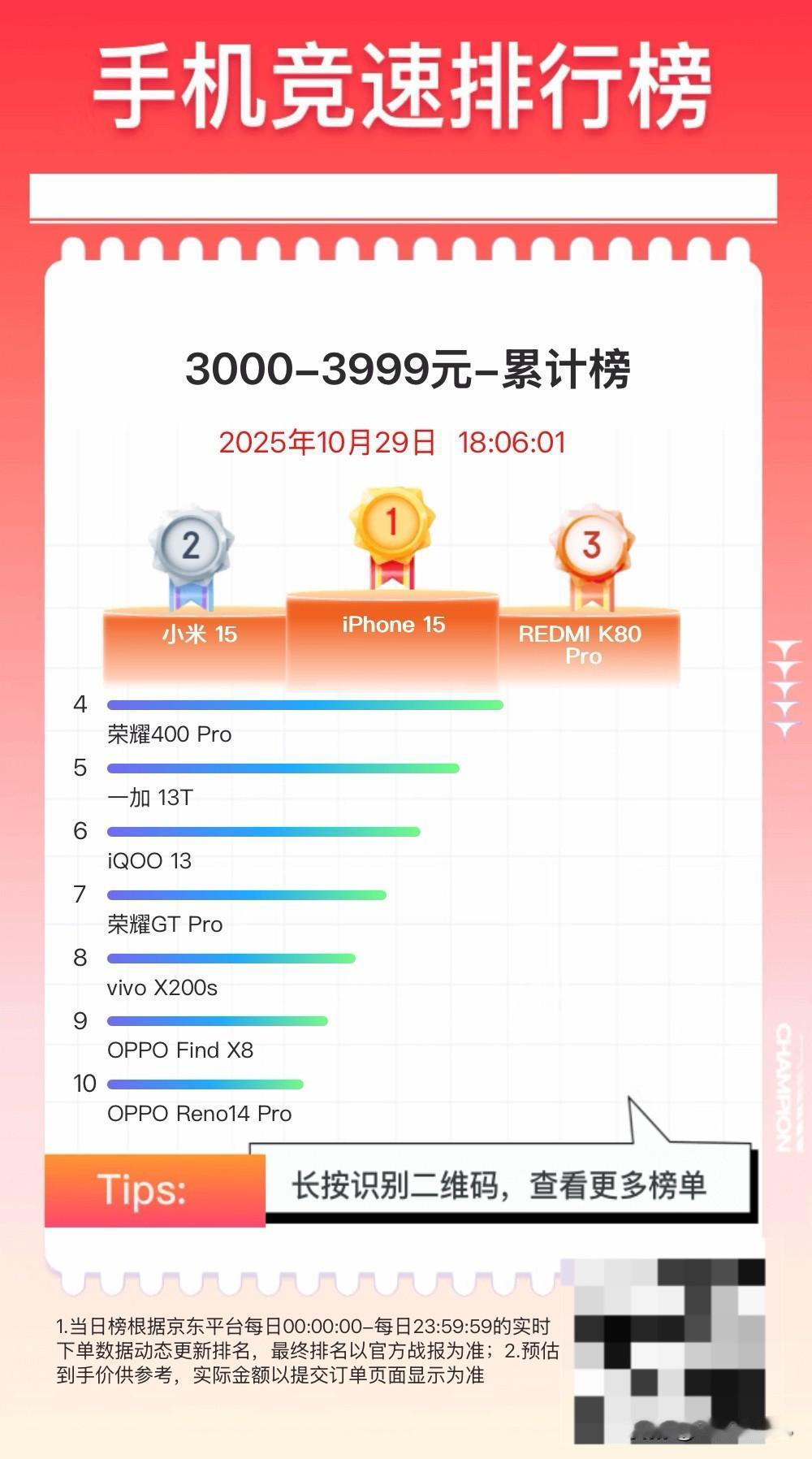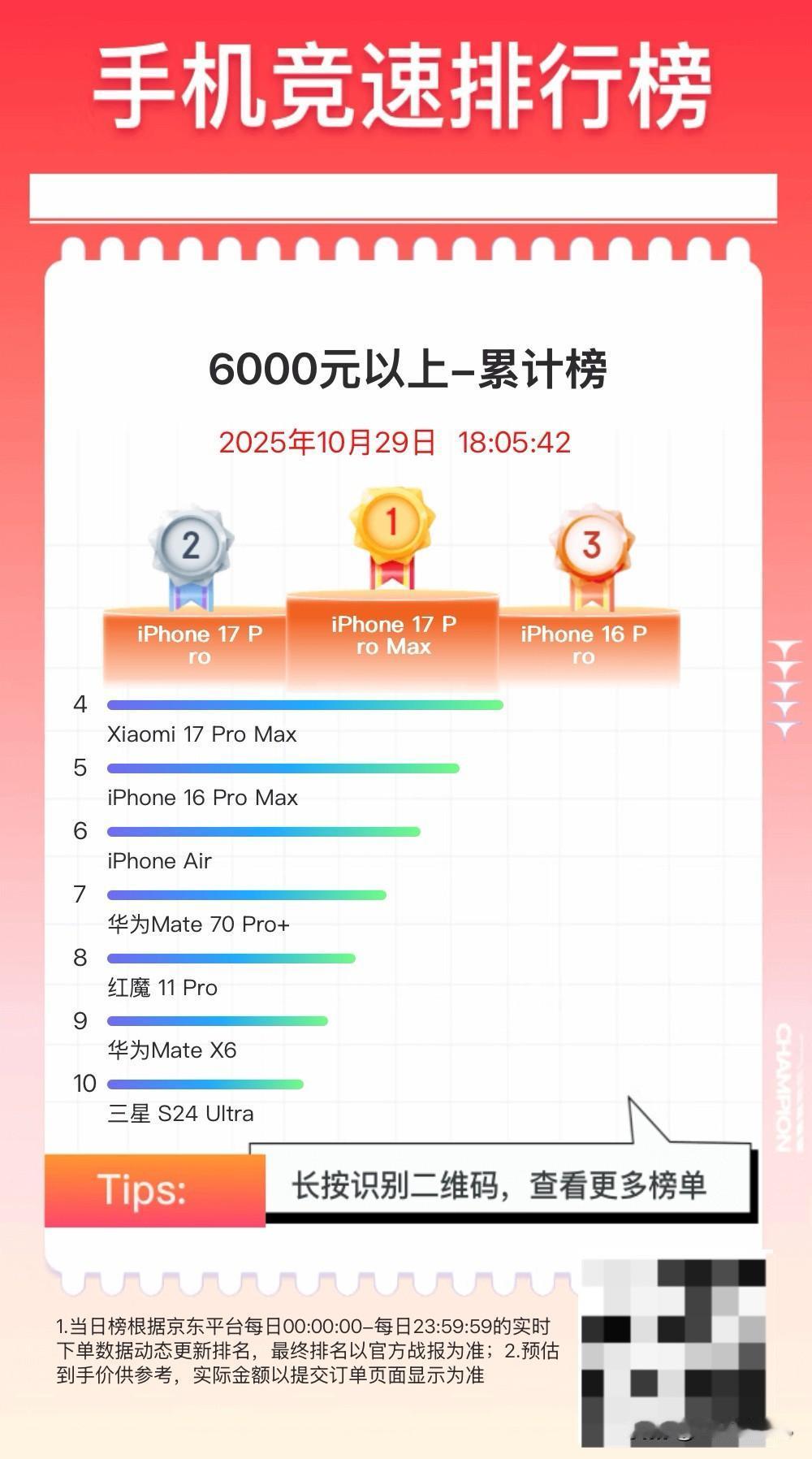 看各家的双十一战报不如看这个实在: 某东实时的累计销量排名,有没有你买过的型号? 单品累计销量 TOP3:1、iPhone 17 Pro Max 2、iPhone 17 Pro 3、iPhone 17 新品手机累计销量 TOP6(iPhone 太难超越了,所以看到 TOP6 吧):1、iPhone 17 Pro Max 2、iPhone 17 Pro 3、iPhone 17 4、iQOO 15 5、小米 17 Pro Max 6、小米 17 Pro 6000 元以上累计销量 TOP3:1、iPhone 17 Pro Max 2、iPhone 17 Pro 3、iPhone 16 Pro 4000-5999 元累计销量 TOP3:1、iPhone 17 2、iQOO 15 3、vivo X300 Pro 3000-3999 元价位段累计销量 TOP 3:1、iPhone 15 2、小米15 3、REDMI K80 Pro 2000-2999 元价位段累计销量 TOP3:1、荣耀 400 2、REDMI K80 至尊版 3、一加Ace 5 1500-1999 元价位段累计销量 TOP3:1、REDMI Turbo4 Pro 2、REDMI K80 3、荣耀200 1000-1499 元价位段累计销量 TOP3:1、荣耀 X70 2、REDMI Note15 Pro 3、REDMI Turbo4 500-999 元价位段累计销量 TOP3:1、REDMI Note 14 5G 2、OPPO A3i 3、REDMI Note 13 5G