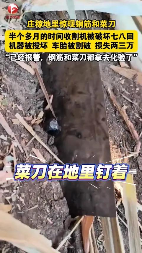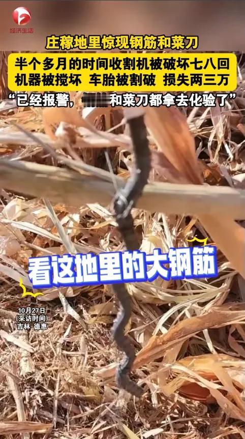 查到底! 2025年10月,吉林德惠,一男子开收割机收自家地里的粮食,结果多次从地里发现钢筋、菜刀,收割机坏了七八回,不仅耽误收粮食,修机器还需要一大笔钱。 对此赵先生非常懊恼,机器坏了是小事,可是不能耽误收粮食的进度啊,不知道究竟是谁这么缺德,放这些东西故意搞破坏。 目前,赵先生已经报了警,将从地里发现的钢筋和菜刀都拿去化验,希望能找到有用的线索,早日将凶手抓到。 网友评论: 人活着要大肚,活着仗义,不要坑害别人。和气生财,才是人生归根。 这种事情公安机关一定要高度重视。土地是农民的命根子,不管有什么个人恩怨都不能用这科行为坑害别人。 这样的阴损小人一定要严查,判他个十年八年的! 钱不是一个人挣得,但是你不要做那些损人不利己的事儿,一定将其早日绳之于法,要狠狠的处理,让他倾家荡产。 对那个干缺德事的人必须严惩不贷。