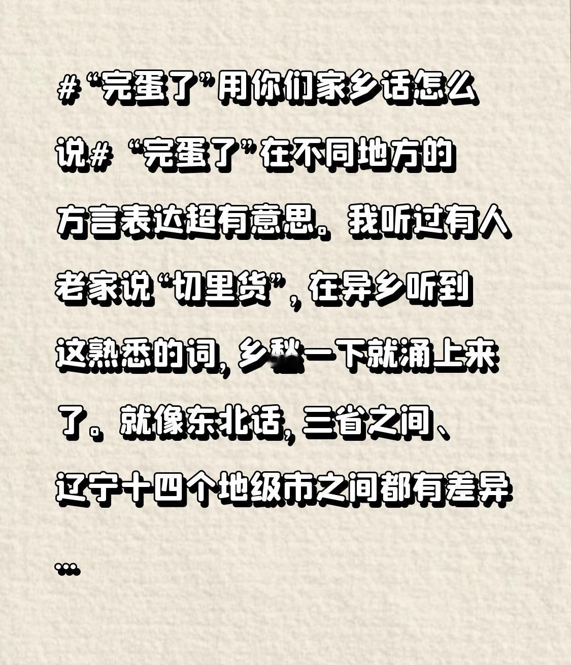 “完蛋了”在不同地方的方言表达超有意思。我听过有人老家说“切里货”,在异乡听到这熟悉的词,乡愁一下就涌上来了。就像东北话,三省之间、辽宁十四个地级市之间都有差异。比如本溪县方言里,“客”代表“去”,“哈什”是仓房的意思。我家乡说“完蛋了”是“歇菜了”,感觉一下就有那股子无奈又略带调侃的劲儿。方言真是文化宝藏,每个词都藏着家乡的记忆和特色。