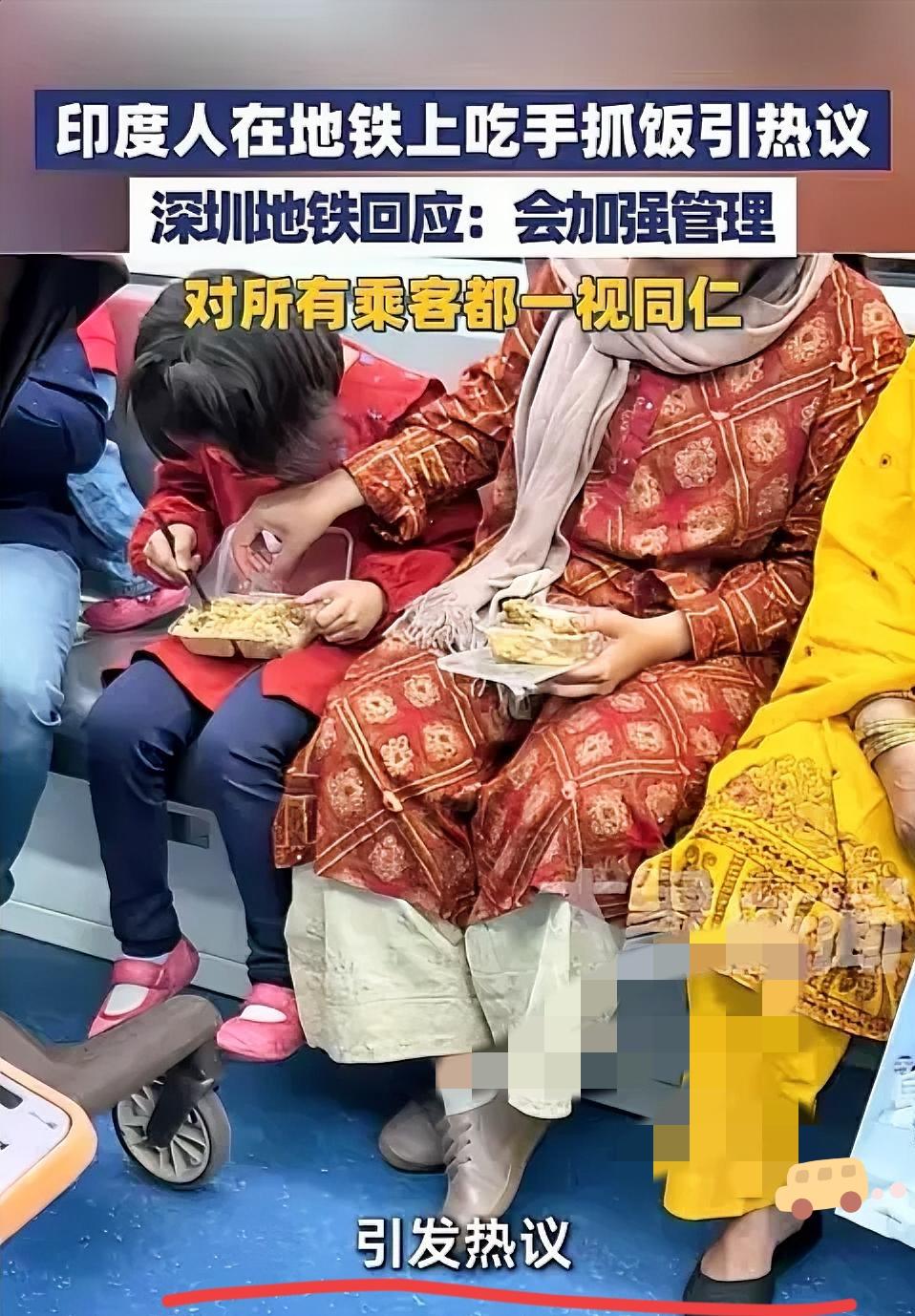 “滚回自己的国家!”10月25日,广东深圳,几名印度人坐地铁时,竟然在大庭广众之下吃手抓饭!虽然有人上前劝阻过他们,可印度人根本不听,地铁站回应:对所有乘客都一视同仁,不会因为是外国人不管。 说真的,“滚回自己国家”这话太冲了,但地铁里吃手抓饭确实不妥。封闭车厢里食物味散不开,周围人看着也膈应,关键是咱们自己带个包子都得偷偷吃,哪能因为是外国人就搞特殊? 有人说要尊重不同文化,可尊重是相互的啊!你在人家的公共空间里,就得先守人家的规矩,这跟哪国人没关系。深圳地铁说“一视同仁”,这话听着提气,要是真能做到不管是谁违规都及时制止,比事后回应管用多了。 其实这事核心不是针对谁,是规则能不能管住所有人。要是规则只对一部分人有用,那公平感不就没了?你们平时在公共场合遇到过类似不守规矩的事吗?当时是怎么处理的?