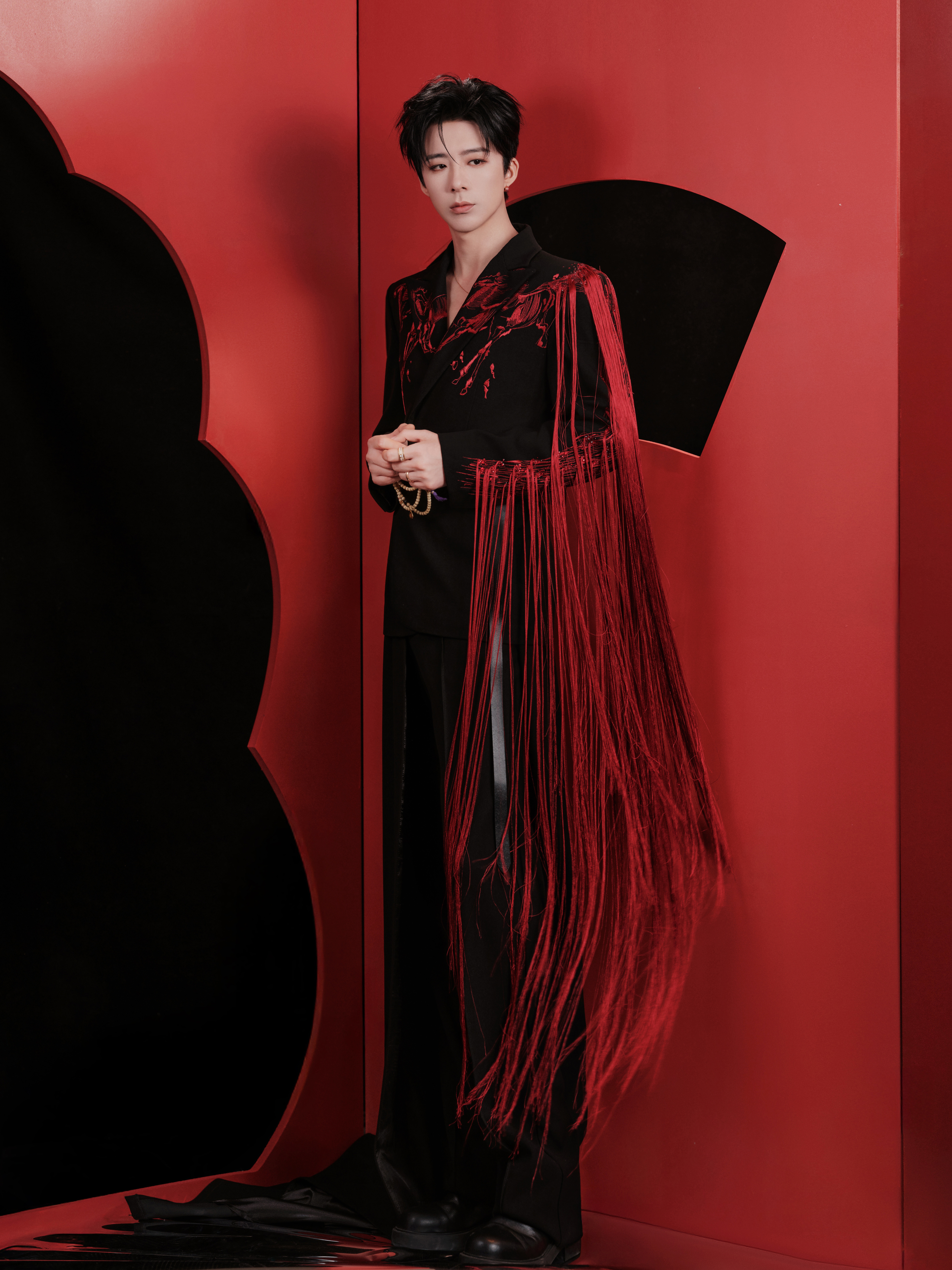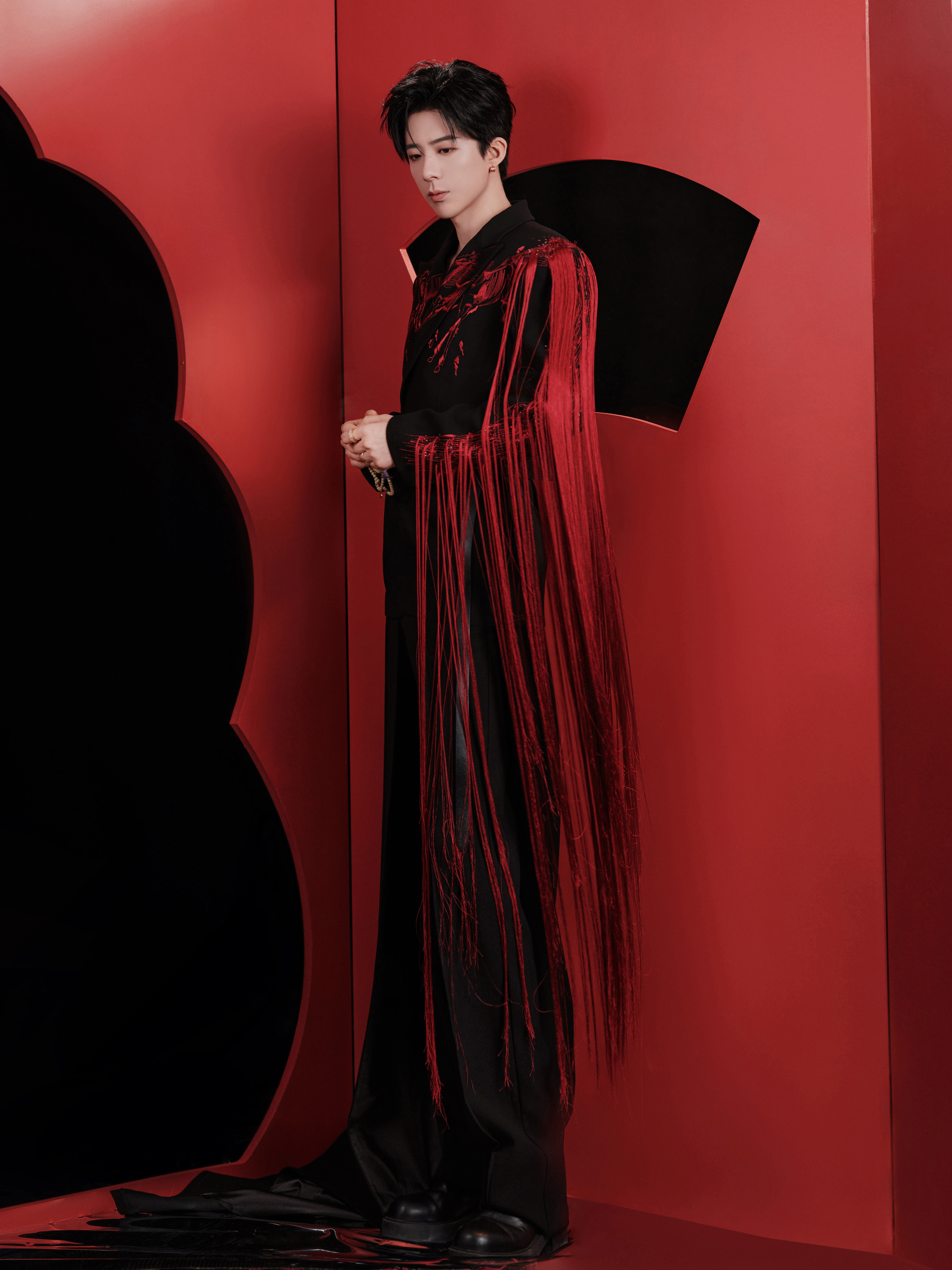 刘宇宁今日出席美好奇妙夜舞台造型,演绎来自国风时装品牌三寸盛京2026春夏系列的礼服,佩戴全套Piaget伯爵珠宝,帅气而且气场十足,超长的红色流苏装饰也很适合他,依然男模范~