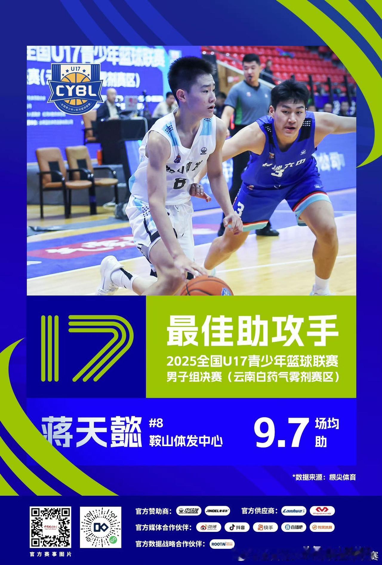 山西汾酒男篮球员蒋雨恒入选2025全国U17青少年篮球联赛男子决赛最佳五人阵容! 全国U17青少年篮球联赛已经落下帷幕。有五位球员入选决赛最佳阵容。他们分别是上海久事男篮中锋张子一、浙江广厦前锋黄健豪、上海久事男篮前锋张懿赵杰、浙江广厦男篮后卫王子超、山西汾酒男篮后卫蒋雨恒。其中,蒋雨恒以场均14.3分、4.9板、3.9助攻,回合占有率22.8%,真实命中率61.8%入选最佳阵容选。 另外,U17男子组决赛单项数据榜公布。湖南球员宋远航以场均得24.9分当选最佳得分手,长沙六中许铭楷以场均3.6当选最佳盖帽手,浙江广厦黄健豪以场均12.8当选最佳篮板手,阜新篮校蒋继鹏以场均4.7当选最佳抢断手,上海久事张子一以场均47.8%的三分命中率当选最佳三分手,鞍山体发中心蒋天懿以场均9.7个助攻当选最佳助攻手。 青春没有售价,拼搏没有几年。但愿未来几年的CBA赛场,有他们大显身手的机会。