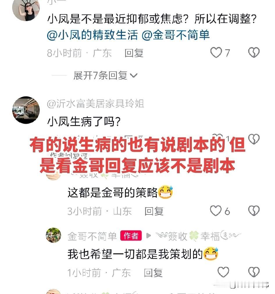 出大事了!千万网红,小凤身体出大问题了! 金哥修改主页面了【爱生活,爱小凤。感谢大家的关心,我会好好照顾她的,放心!】 还有金哥在评论区回复粉丝的内容,处处透露着小凤身体出现了大问题。 粉丝们疯狂的在问小冯身体出现了什么问题,但是金哥及其小芳的家人都没有做正面答复,这说明小峰的身体出现的问题不是一般的小问题。 以他们家人的性格,如果小凤身体出现的是小问题,他们会一个简短的小视频告知大家。现在无论粉丝怎么追问,小风的家人都不会做正面答复。 ★小风的身体出现了大问题,不方便把病情透露给网友。 ★小凤此次停播,可能是金哥策划的,无非为了涨流量吗? 不管是哪种问题,都希望小凤及其家人给网友一面一个正面答复。 希望小凤不要借着网友的关心超流量,那样太可耻了。