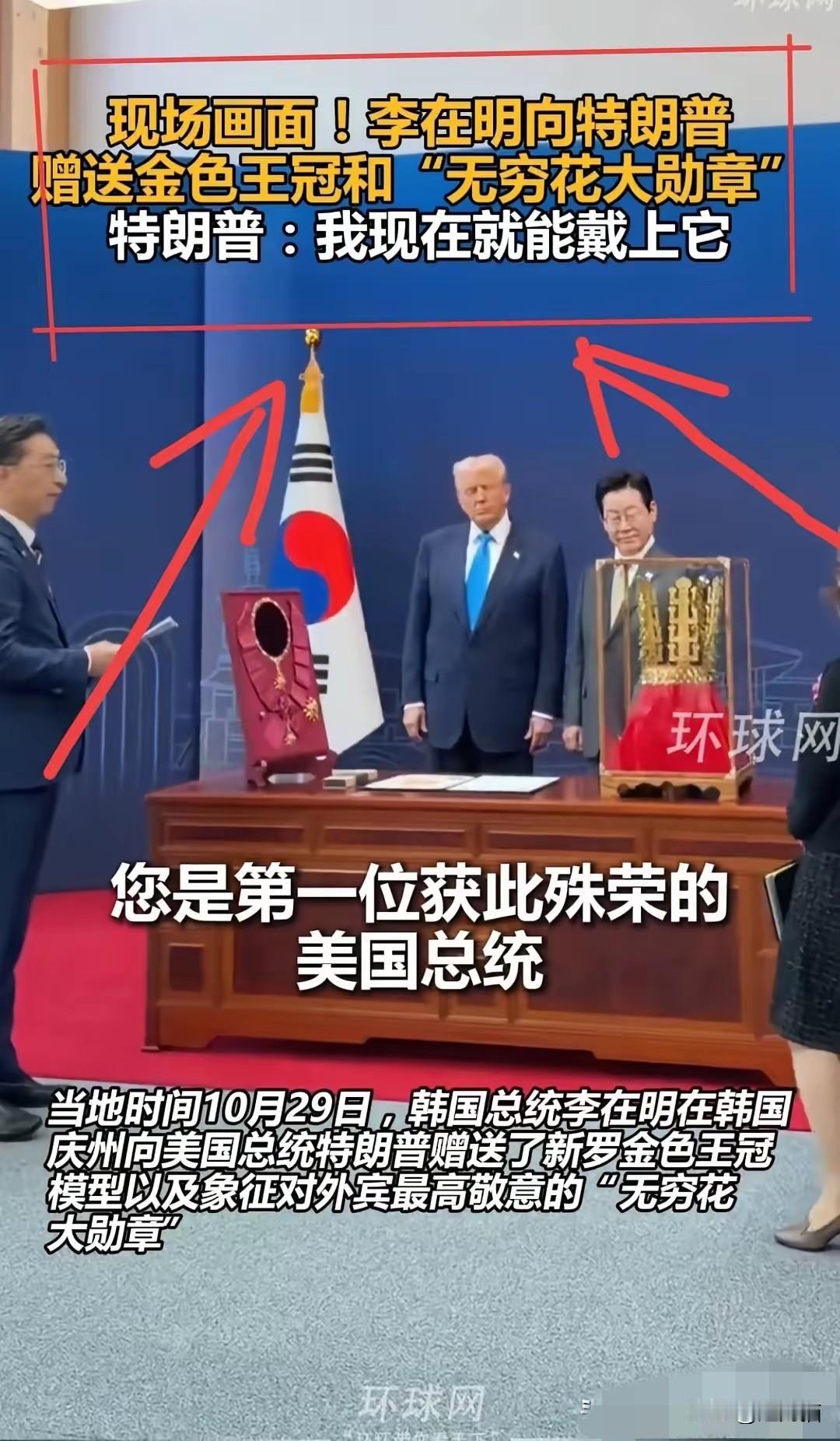 别出心裁的韩国总统李在明,可能歪打正着,替诺贝尔“和平奖”评审委员会,解决了一个大难题!今日,特朗普总统莅临韩国访问。韩国总统李在明,不落俗套,用心良苦地为特朗普总统献上了金色王冠和“无穷花大勋章”。看得出,李在明的投其所好,正中了靶心。特朗普总统貌似对金色王冠与“无穷花大勋章”非常受用。此时此刻,特朗普一直心心念念的诺贝尔“和平奖”大奖章,似乎都要被移情别恋,抛掷一边了……诺贝尔“和平奖”评审委员会,今年,2025年,在左右为难之下,最终还是没有将诺贝尔“和平奖”授予美国总统特朗普。但是,只要特朗普的诺贝尔“和平奖”奖章还未到手;至少在2026、2027、2028年,诺贝尔“和平奖”评审委员会,都将面临左右为难的难题,和空前的压力。李在明献上的金色王冠和“无穷花大勋章”,如果能让特朗普淡忘甚至漠视了诺贝尔“和平奖”,那岂不是,替诺贝尔“和平奖”评审委员会,解决了一个,“历史性”的难题?此事,头条网友们怎么看呢…… 先得说李在明这手“投其所好”,精准度简直能当教科书。他送的可不是普通纪念品——那顶金色王冠,复刻的是新罗时期的君主头饰,在韩国文化里象征“至高荣誉”;“无穷花大勋章”更不用说,是韩国给外国元首的最高礼遇,之前只有德国总理朔尔茨、印度总理莫迪等少数人得过,特朗普能成为首个获此勋章的美国总统,脸上早就乐开了花。看现场视频,特朗普捧着王冠反复端详,还对着镜头竖起大拇指,那股子得意劲儿,比当年他在联合国大会上吹嘘“美国优先”时还明显。 李在明为啥这么懂特朗普?说白了,就是摸透了这位美国前总统的“荣誉癖”。特朗普这辈子就爱收集各种奖章、称号,上一任时就因为没拿到诺贝尔和平奖耿耿于怀,甚至让助手私下联系挪威政府“求推荐”,结果被人家公开打脸。2020年他还酸溜溜地说“奥巴马那个和平奖得的莫名其妙,我才该得”,这话至今还在社交平台上挂着。李在明显然研究过这些细节,知道与其跟特朗普谈复杂的军事同盟,不如送个能让他“炫耀”的荣誉来得实在——毕竟对特朗普来说,能在支持者面前晒出“韩国国王同款王冠”,比签十份合作协议还能刷存在感。 再看诺贝尔和平奖评审委员会,这几年确实被特朗普搞得头大。2024年美国大选后,特朗普重新活跃在国际舞台,一会儿说要“调解俄乌冲突”,一会儿又宣称“能让中东实现永久和平”,明里暗里都在给评审委员会递“申请信号”。可评审们也犯难:给吧,特朗普任内退出《巴黎协定》、撕毁《伊核协议》,还曾下令空袭叙利亚,这些“黑历史”跟“和平”二字压根不沾边;不给吧,又怕被美国保守派骂“政治偏见”,甚至影响挪威跟美国的关系。2025年最终没给他,据说评审会上争论了整整三天,最后还是以“缺乏实质性和平贡献”为由否决,可私下里有人透露“明年要是他还来闹,真不知道该怎么应对”。 现在李在明送了这顶王冠,倒真可能帮评审委员会解了围。特朗普这人记仇也记好,谁给了他面子他能念叨好几年。之前日本首相岸田文雄请他吃了顿和牛,他就逢人夸“岸田是我最好的亚洲朋友”;这次韩国直接送“王冠+勋章”组合,估计他接下来几个月都会把精力放在“晒荣誉”上,说不定真就暂时忘了诺贝尔和平奖这茬。有网友调侃“李在明这是给诺贝尔委员会递了台阶,不然明年他们还得纠结到脱发”,这话虽然夸张,却也戳中了关键——比起虚无缥缈的“和平奖”,特朗普显然更在意能立刻拿来“炫耀”的实际荣誉。 不过这事也透着股讽刺味。诺贝尔和平奖创立初衷是奖励“为促进民族团结友好、取消或裁减常备军队以及为和平会议的组织和宣传尽到最大努力或作出最大贡献的人”,可如今却成了政客们的“面子工具”;而韩国作为美国的盟友,不是靠平等合作维护关系,反而要靠送“王冠”这种带有封建色彩的礼物来讨好,说到底还是霸权体系下的无奈。有位韩国网友在社交平台上吐槽“我们总统不是在搞外交,是在给美国老板送圣诞礼物”,这话或许才是最清醒的评价。 至于特朗普会不会真的“移情别恋”,现在还不好说。毕竟对他来说,“诺贝尔和平奖”是“国际认可”的终极象征,说不定过阵子又会旧事重提。但至少眼下,李在明这波操作,确实让诺贝尔和平奖评审委员会暂时松了口气——也算是给这场充满荒诞感的外交闹剧,添了个让人哭笑不得的小插曲。