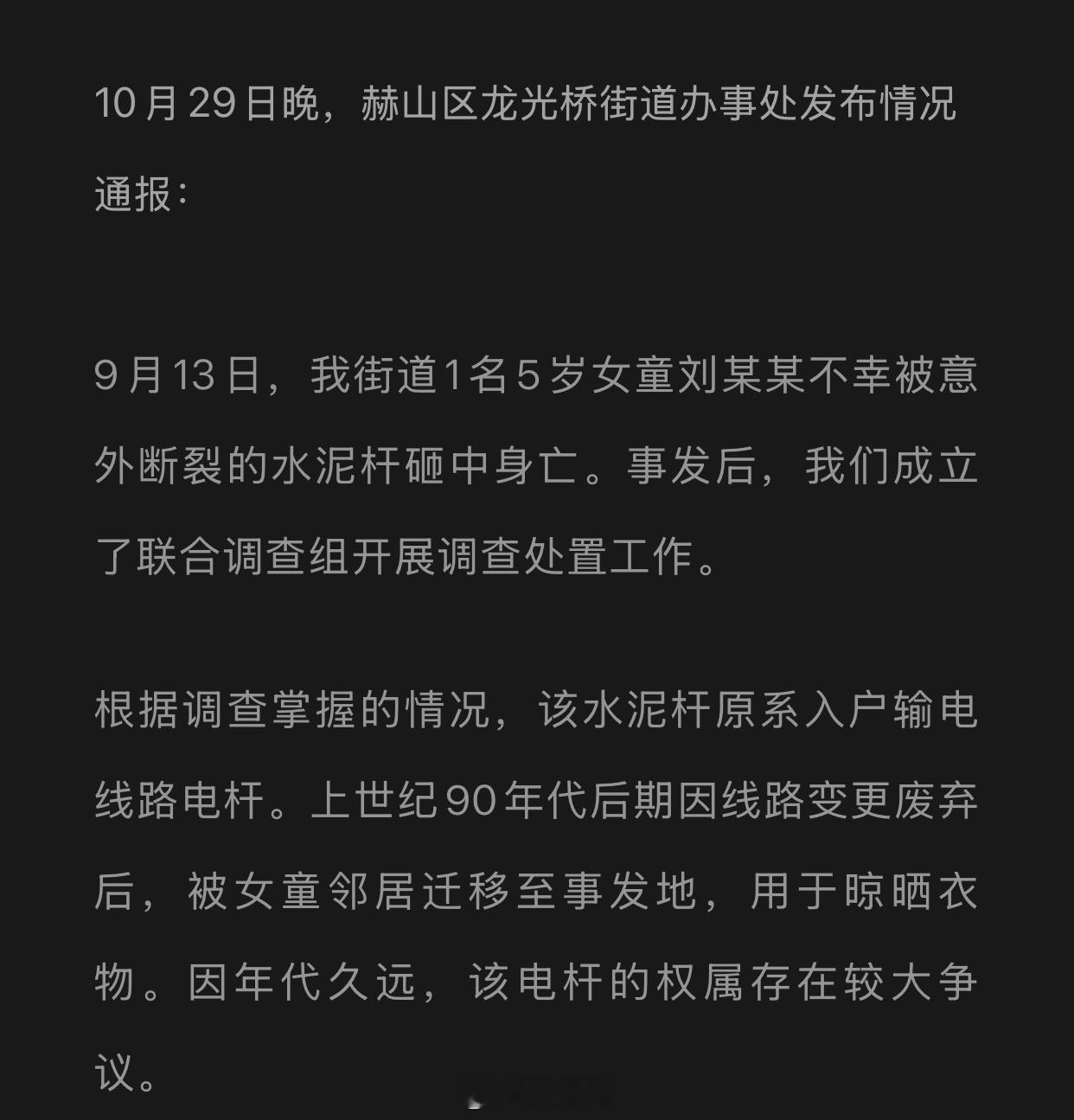 赫山区龙光桥街道办事处的通报中明确提及,涉事的水泥杆是上个世纪90年代末被废弃,权属不明,但被女童家的邻居迁移至事发地,用于晾晒衣物。水泥杆断裂砸中女童致其身亡。