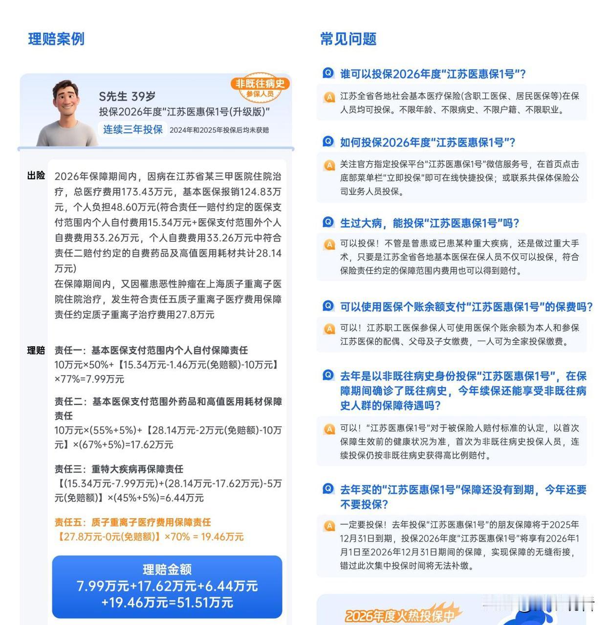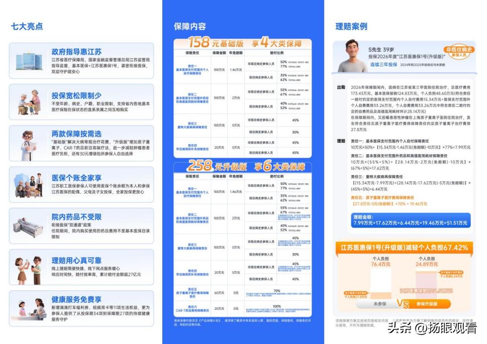 江苏医惠保1号是全家人的健康护盾,你参保了吗?因为在生活的舞台上,疾病就像一场不期而至的暴风雨,随时可能打破家庭的平静。对于江苏的朋友们来说,“江苏医惠保1号”就是那把能为家人遮风挡雨的保护伞。 先来说说孩子。孩子就像娇嫩的花朵,成长过程中却可能遭遇疾病侵袭。小阳是个活泼的7岁男孩,不幸患上了脑部恶性肿瘤。这突如其来的重病,让原本幸福的家庭陷入了困境,高额的治疗费用如同一座沉重的大山。好在小阳的父母为他投保了“江苏医惠保1号”,在医保报销后,这份保险又赔付了7.69万元,直接减轻了近一半的个人负担,让小阳的治疗之路得以延续,也让这个家庭重新燃起了希望。 再看看家庭顶梁柱们。40岁的张先生是家里的主要经济来源,却不幸被查出患有严重的心脏病。治疗费用高昂,不仅花光了家里的积蓄,后续康复费用也让家庭压力倍增。但因为投保了“江苏医惠保1号”,在医保报销的基础上,又获得了一笔可观的赔付,缓解了经济危机,让张先生能安心养病,家庭也不至于因这场大病而陷入绝境。 还有老人们,随着年龄增长,身体机能下降,疾病频发。王奶奶80多岁了,因慢性疾病住院治疗,医保报销后仍需自费不少费用。而她投保的“江苏医惠保1号”再次报销了一部分,减轻了子女的经济负担,让老人能得到更好的治疗和照顾。 目前,江苏医保参保人可以为自己和家人办理“江苏医惠保1号”的参保,保费标准有158元/年的“基础版”和258元/年的“升级版”,最高保障400万元。而且,它和医保紧密衔接,医保报销后,符合条件的还能通过“江苏医惠保1号”再赔付。大家可以关注当地医保开放参保的时间,别错过这个为家人增添保障的好机会,给全家人的健康加上一道坚固的防线!