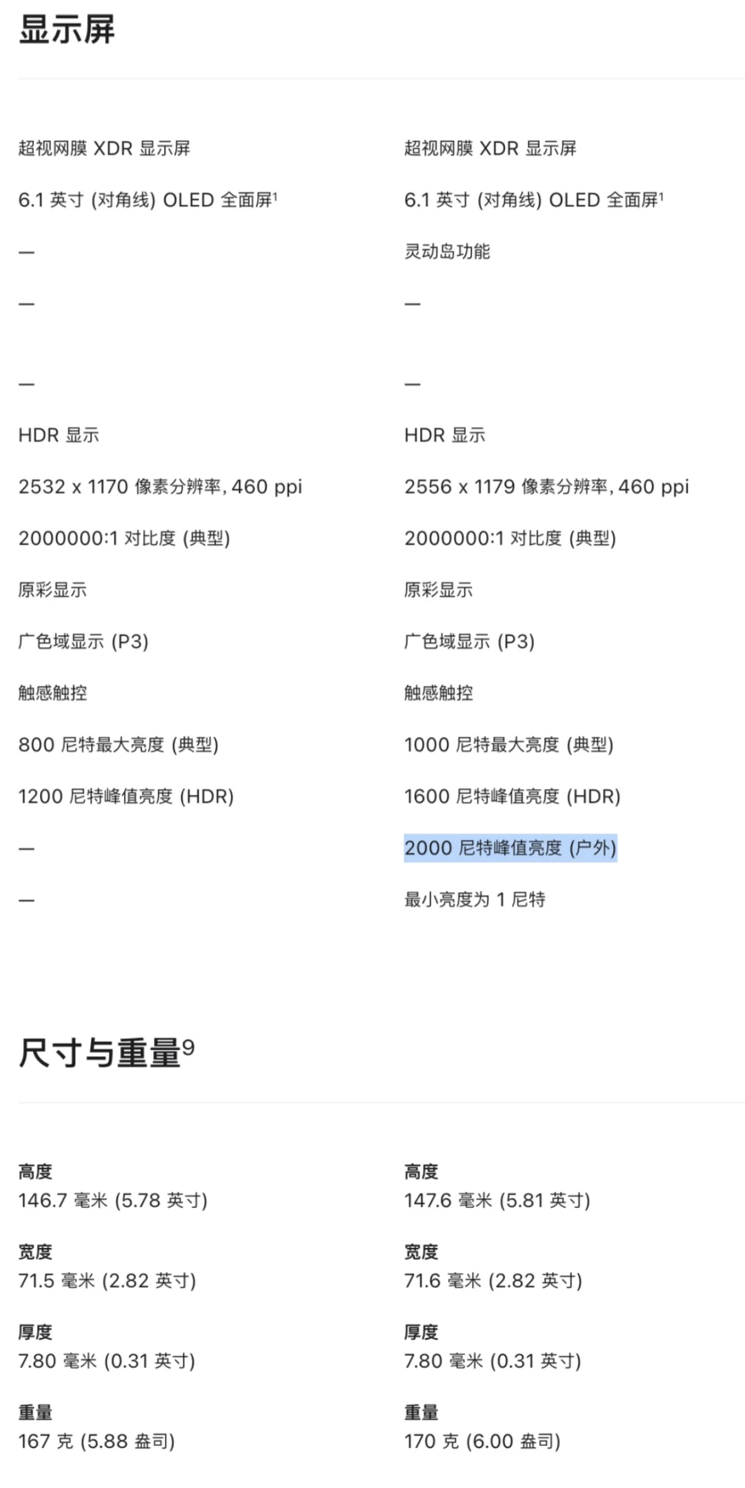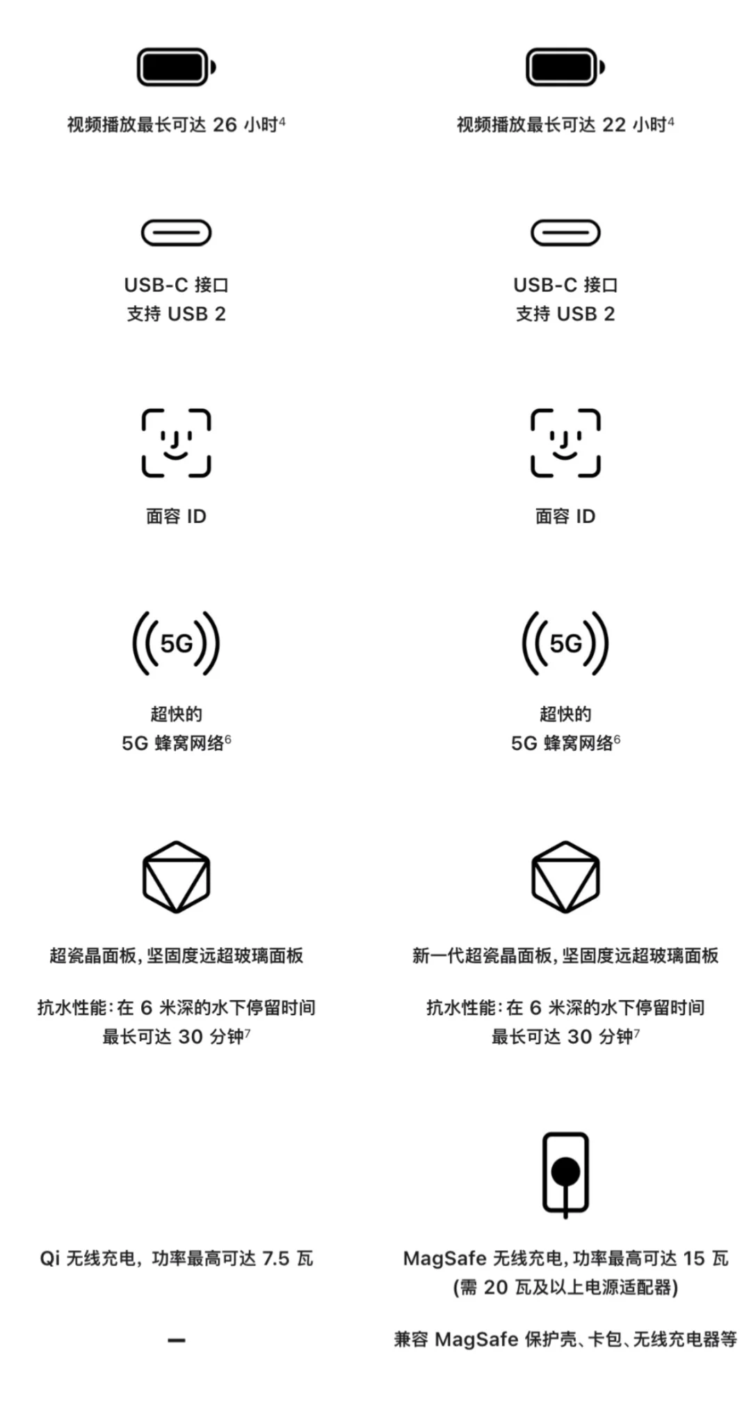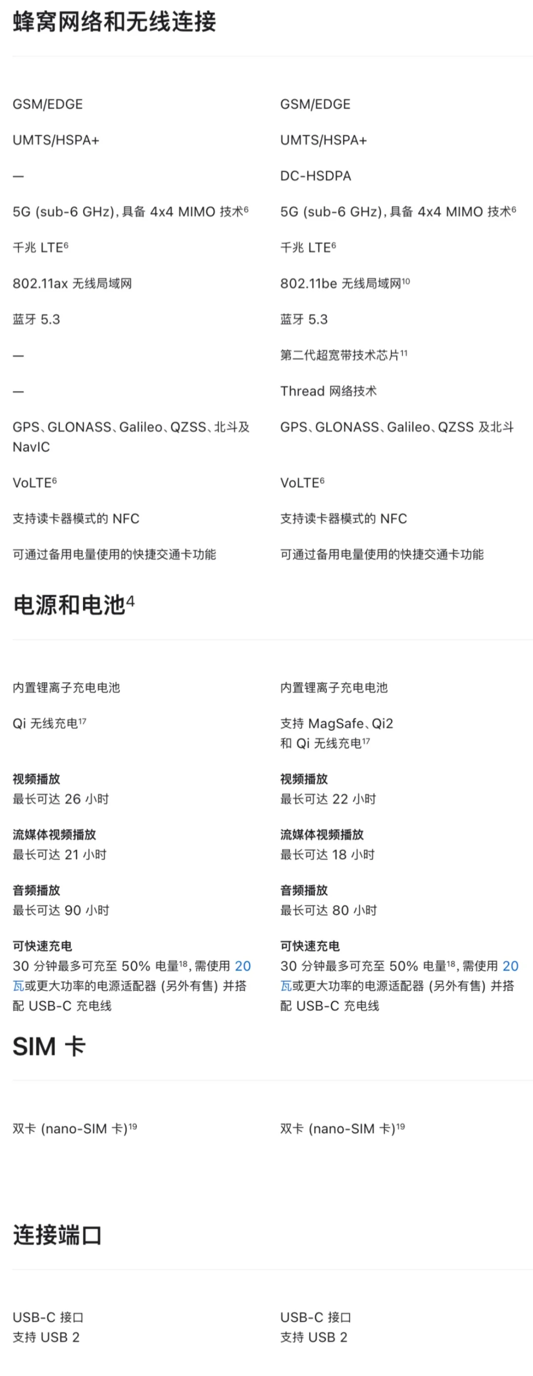 📱iPhone16:灵动岛、户外峰值亮度2000尼特,有单独拍照键,A18芯片(6核CPU+5核GPU)、高通X71基带,支持MagSafe,官网标注视频播放最长可达22小时,后置双摄48MP+12MP超广角,有超宽带技术芯片。