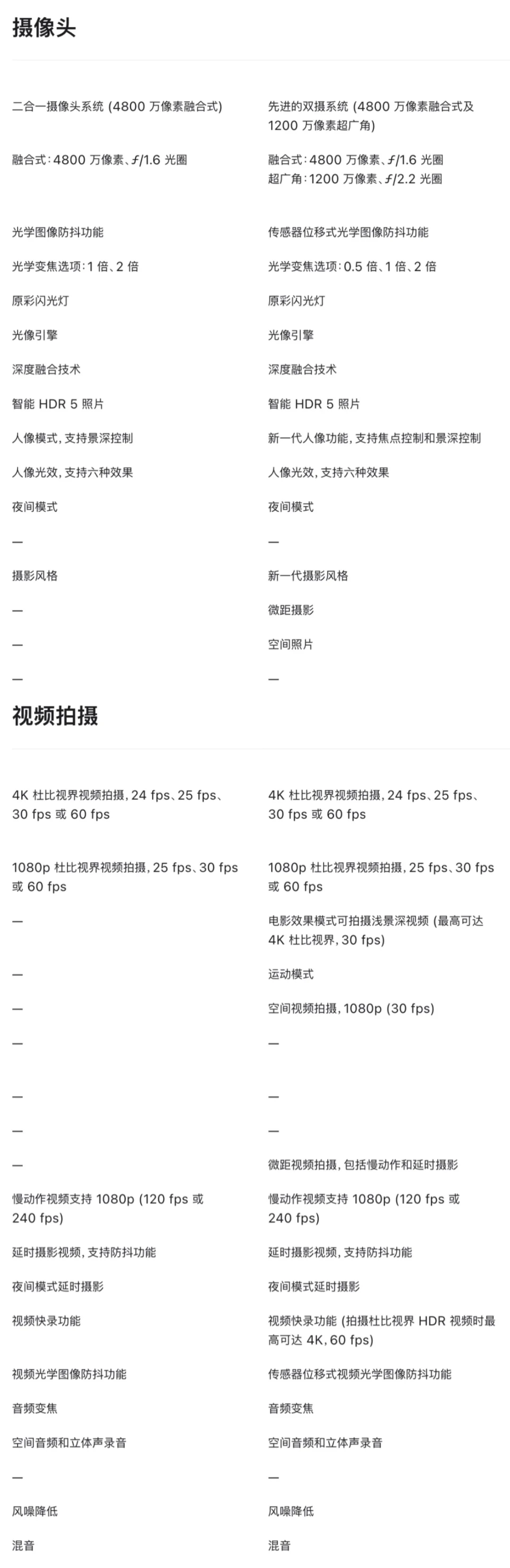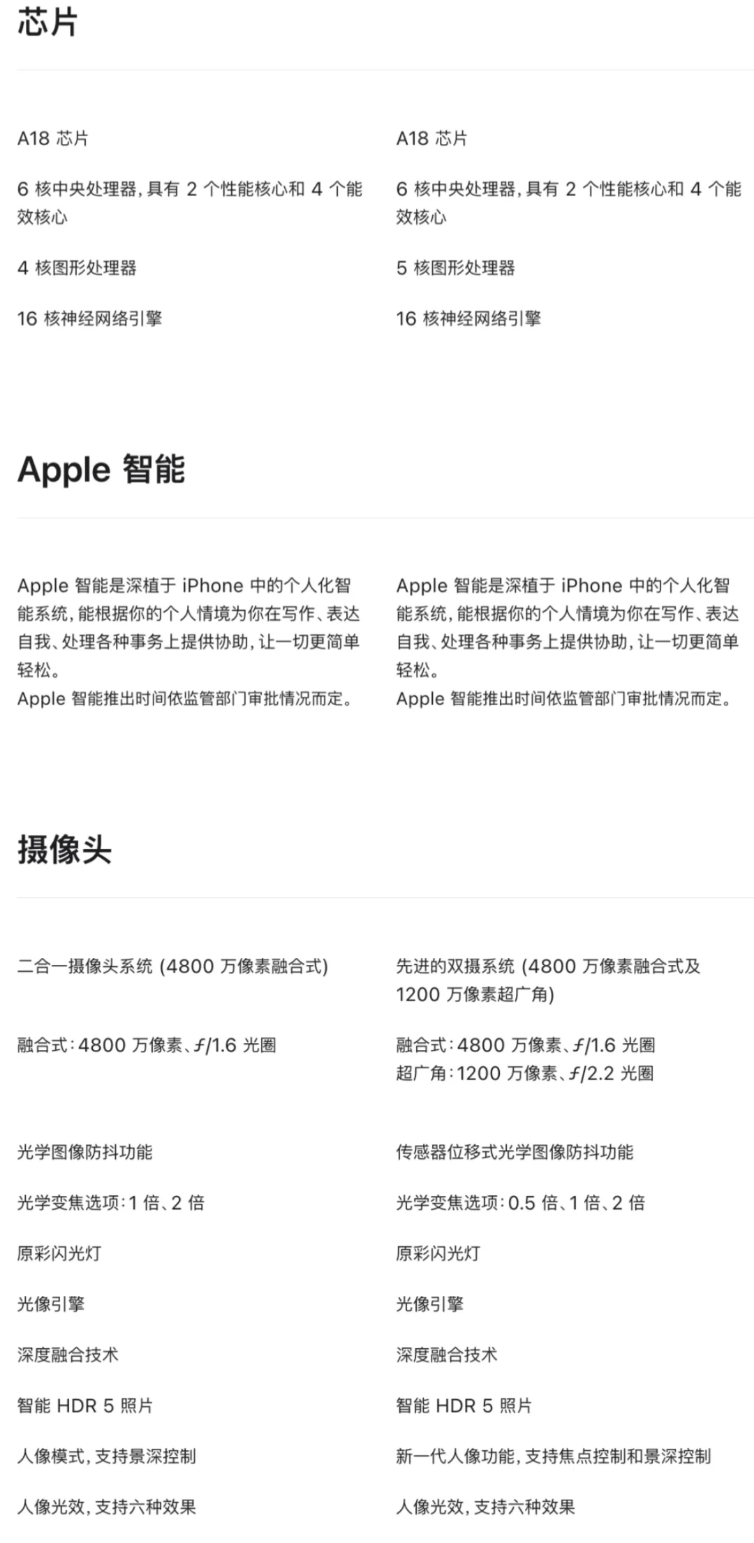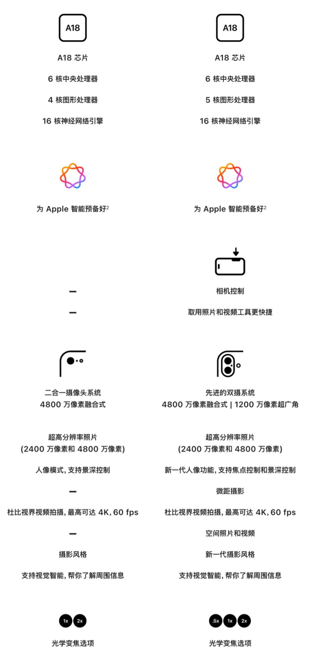📱iPhone16e:刘海屏、没有拍照键,A18芯片(6核CPU+4核GPU)、苹果首款自研5G调制解调器C1基带,不支持MagSafe,官网标注视频播放最长可达26小时,后置单摄48MP,不支持微距/空间照片/运动模式(后续可能支持国补、刚发布暂未通知);