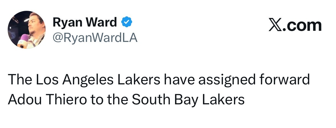 要开始训练了!湖人将前锋阿杜·蒂耶罗下放至南湾湖人。