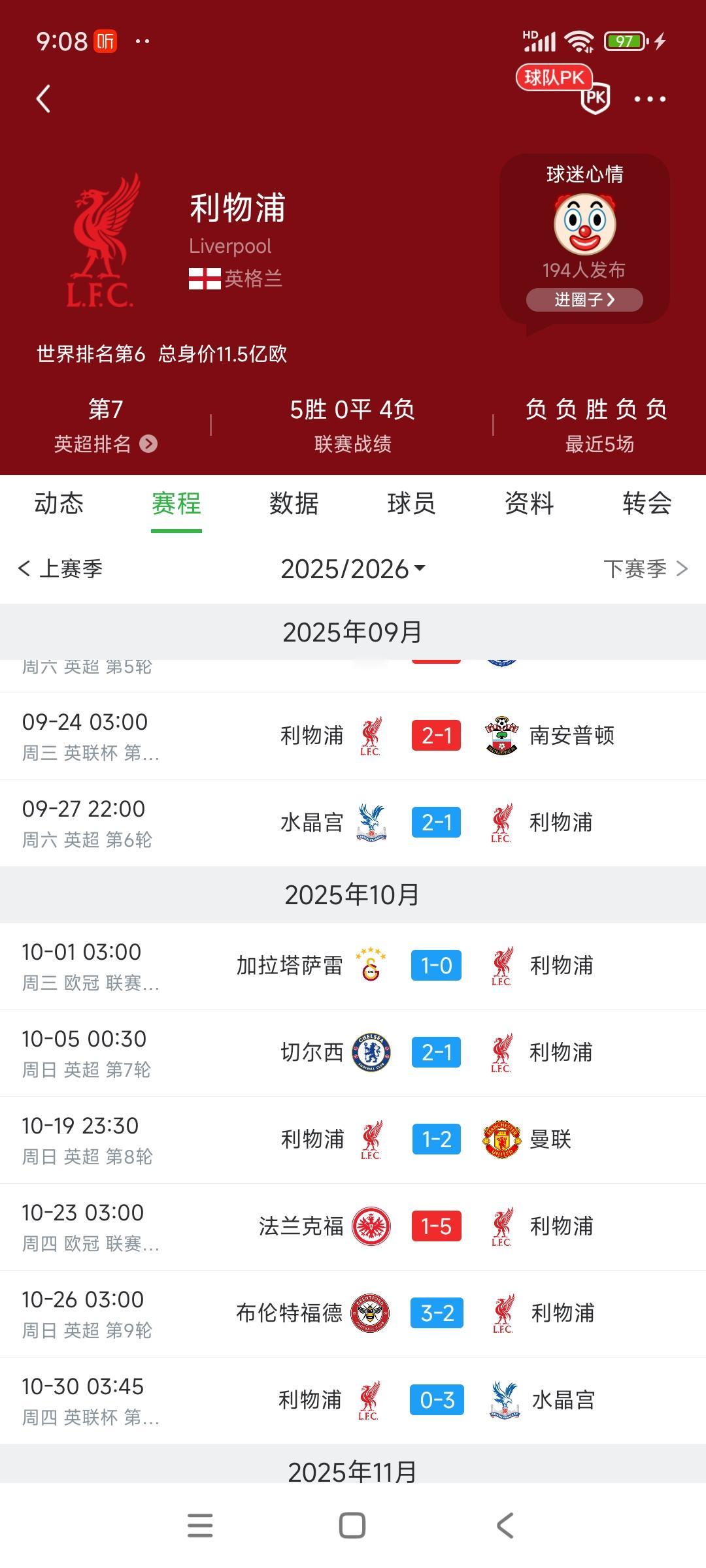 利物浦让人看不懂,最近7场输6场。 只有一场对德甲球队赢了,其他全输。 从英超第一降到第七名,排名还不如曼联。 发生了什么事?不就是埃基蒂克那会一张红牌,之后全是被绝杀,不断崩溃。 红军的小王朝就这么的没了,没看懂到底为什么,感觉一场比赛都赢不了。[泣不成声]
