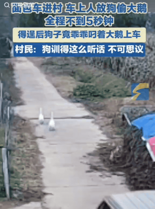 江苏连云港,面包车进村后,车上人员放下了一条狗偷大鹅,全程不到5秒钟。得逞后狗子竟乖乖叼着大鹅上车。网友:能把狗训得这么听话,不可思议。 开面包车偷狗的见多了,没想到还有训狗偷大鹅的,这还真是第一次见到。 村民王先生发现大鹅少了一只以后,调出监控查看,才发现大鹅竟是被一条狗给偷走了,让他非常意外的是,偷大鹅的贼竟能把狗训的这么听话。 视频中,几只大鹅看到有车驶过,也是非常懂事的跑到旁边,怕影响别人开车,谁知道这面包车不安好心,突然车子停顿了一下跳下来一条狗,径直冲向了大鹅,不到5秒钟的时间就把大鹅成功叼上了车。 这段监控上传到网络之后,也是引起了网友的热议。有网友说:这条狗动作娴熟,一看就是惯犯,看来没少偷大鹅。 有网友问:那这算是人偷的,还是算狗偷的?谁是从犯?谁是主谋? 不得不说,偷鹅贼有这训狗的本领,随便开个宠物店帮别人训训狗,不好吗?现在养宠物的人那么多,应该是个不错的营生,却非要去干这不劳而获的坏事。 对这件事你有什么看法? 来源:闪电新闻