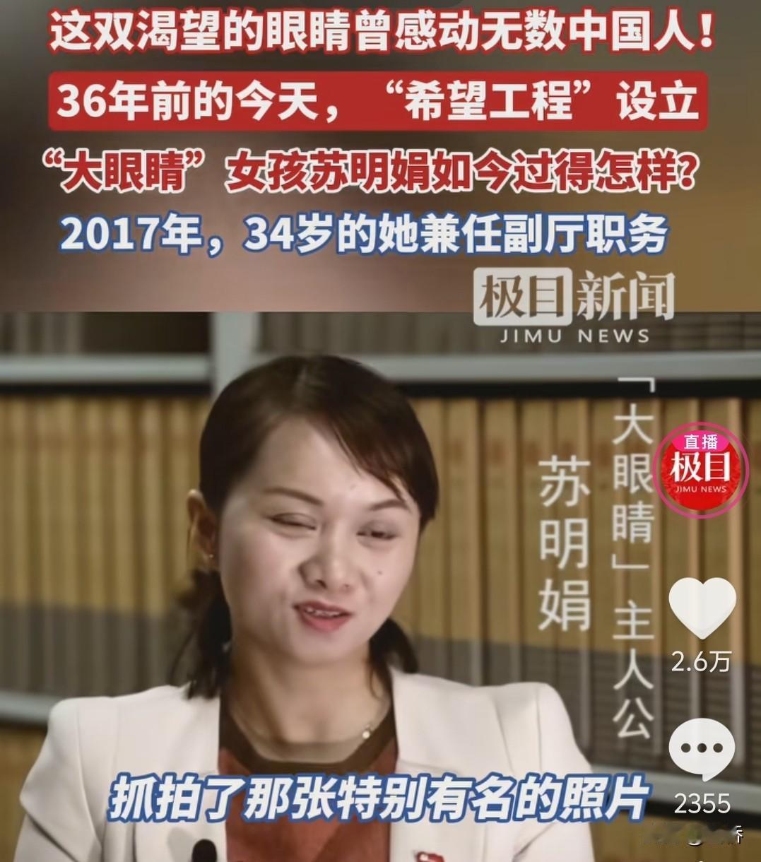 34年前,那个渴望上学的“大眼睛”女孩苏明娟,现在过的怎么样了? 1991年,解海龙的一张《大眼睛》照片让全国人民记住了她,引发了众人对于农村失学儿童的关注,而这张照片更是被中国青少年发展基金会用作希望工程的标志。 这张照片也改变了苏明娟的命运,他靠资助走出了大山,2002年考上了安徽大学职业技术学院,之后进入银行工作。苏明娟也并没有忘记来时路,她在参加工作后,也是尽自己的能力去回馈社会。她每年都会花1000元资助贫困生,从未间断。 2018年6月12日,她来到安徽省青少年发展基金会,设立了“苏明娟助学基金”,同时拿出了3万元积蓄作为启动资金。 2017年12月15日苏明娟当选共青团安徽省委副书记(兼职),也就是副厅级职务了,现任中国工商银行安徽省分行团委副书记。 有网友说:我是80后,小时候看到这张照片觉的山区的孩子好可怜,拿出了攒了很久的零花钱50元,就全部都捐了。 不得不说,我也是80后,小时候读小学时,每学期学校都会组织学生给山区或贫困生,又或者是希要帮助的人捐钱,具体说的是捐给谁也有点记不清了,但是都是自己捐多少都行,全部交给班长统计好姓名和金额。 老话说“ 只要功夫深,铁杵磨成针”,虽然是一张照片先改变了她的命运,但是这离不开她日复一日坚持努力的结果,就像铁杵能磨成针,关键在于功夫下得足够深。