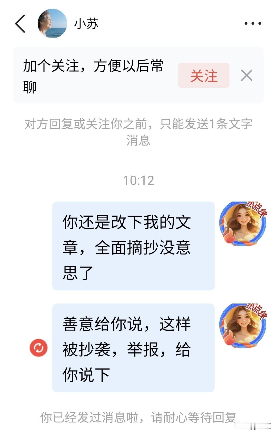 看看现在有些人真做人做事的太没底线了,你抄袭吧可以,改改,不改,一个字都不改,全部抄过来,蹭我的流量,这个老太婆图片叫小苏网友,真的有点无语[发怒] 我好心给她发私信,让她改改,她看到还不改,结果把我拉黑了。 我一气之下举报了她,本来不想举报,就想好好跟她说下,结果她的做法太令人气愤… 这样的人不惯着她,哼! 特别提醒,网友们你发文章也注意看看,自己的有没有被别人抄袭? 原创抄袭 抄袭 抄袭了我的文案