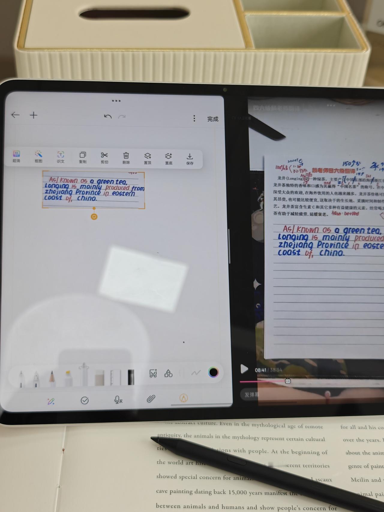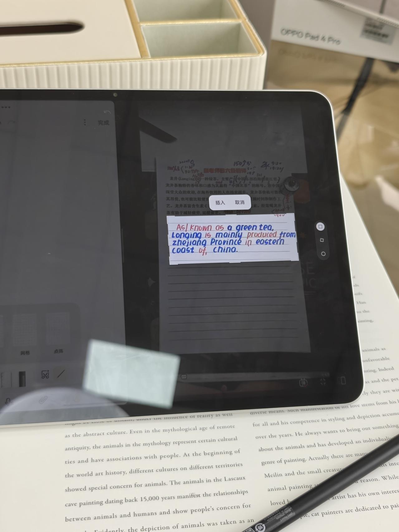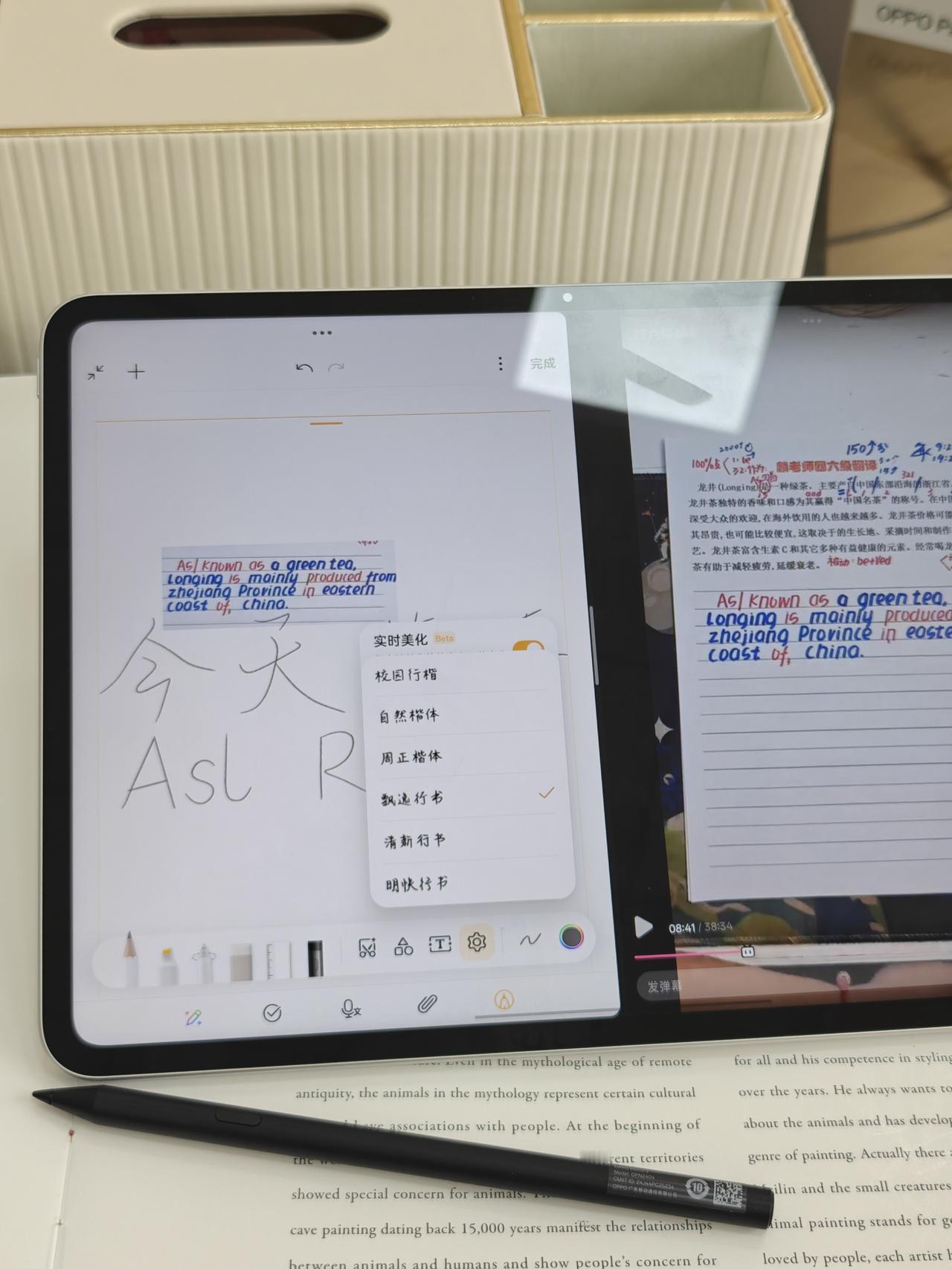 关于OPPO平板手写,忍不住说几句!!!! 人生的第一个平板!!!刚拿到oppo Pad 5兴奋了好久,终于是圆梦了~ 帮大家试了下官方笔,第一次用确实有点不习惯,后面就好很多了,我是没感觉到有延迟。主要是它有个字迹优化功能我觉得挺好用的,上课做笔记的时候只管记就行了,不用管写的咋样,自动给你优化了~ 还有个我觉得挺好用的就是AI超级截取了,一些图片内容可以直接圈选,截取出来,多开分屏边看资料边学习的时候很有用!而且OPPO这款屏幕是柔光屏的,看久了不会费眼睛~ 整体体验我是很满意了,再加上手写笔是活动送的,有学生认证就行,白嫖的用着就是爽啊~