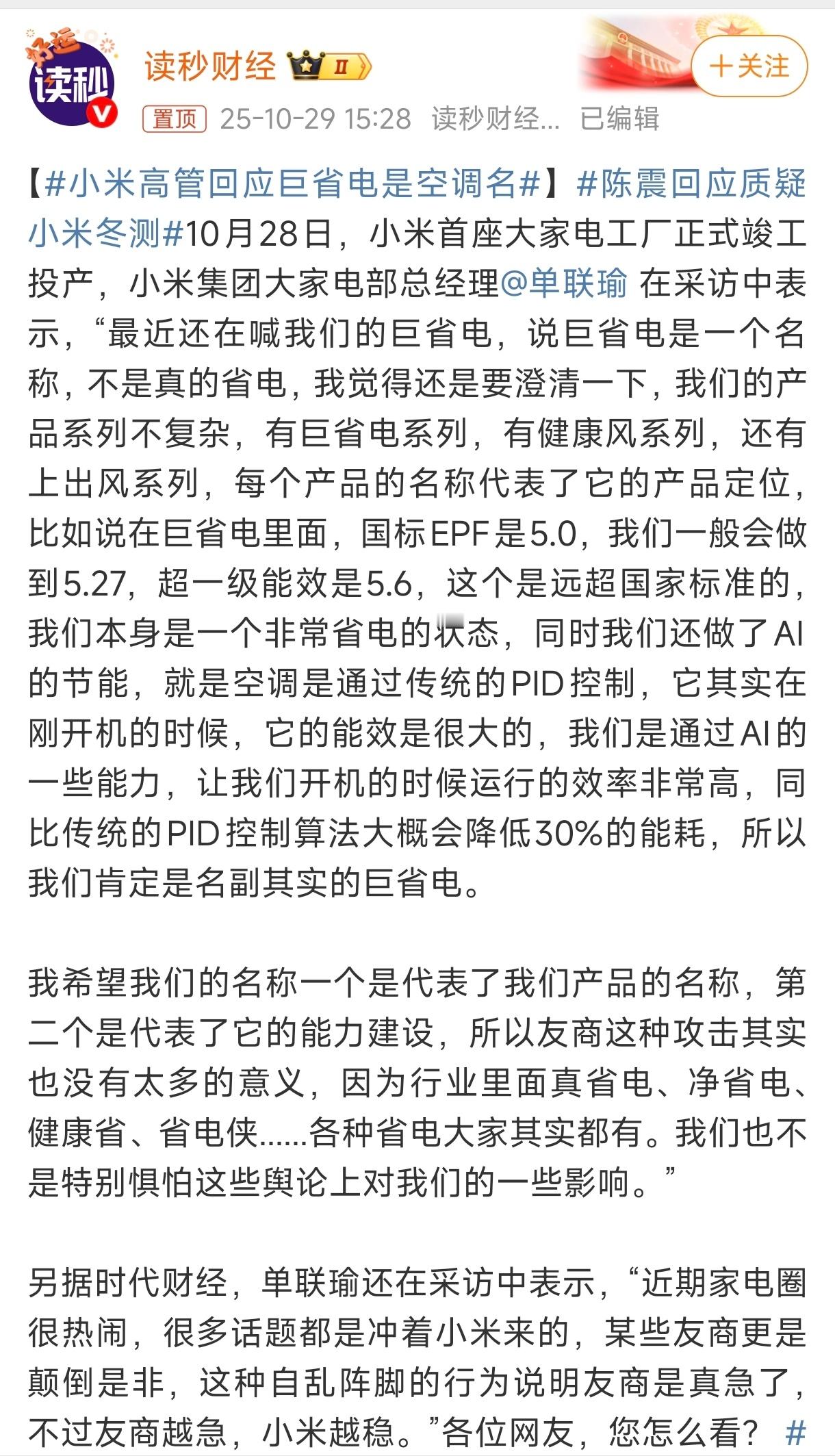 小米高管回应巨省电是空调名