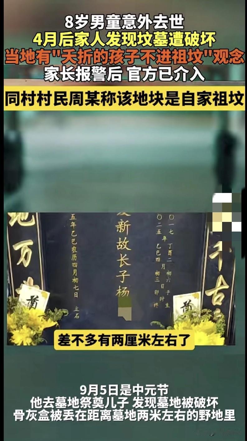 “天呐!8岁男童意外离世才4个月,家人中元节去祭拜,竟发现孩子坟墓被破坏!骨灰盒被扔在离墓地两米的野地里,墓碑还被砸坏了两厘米。同村村民周某声称那是他家祖坟,原因竟是当地有‘夭折孩子不进祖坟’的旧观念。孩子父母得多心碎啊!好好的祭奠成了这样,现在已经报警,官方也介入调查了。这种旧观念和殡葬纠纷搅在一起,真的又气又心酸。大家觉得这事儿该怎么解决?传统习俗和逝者权益之间该咋平衡呢?”