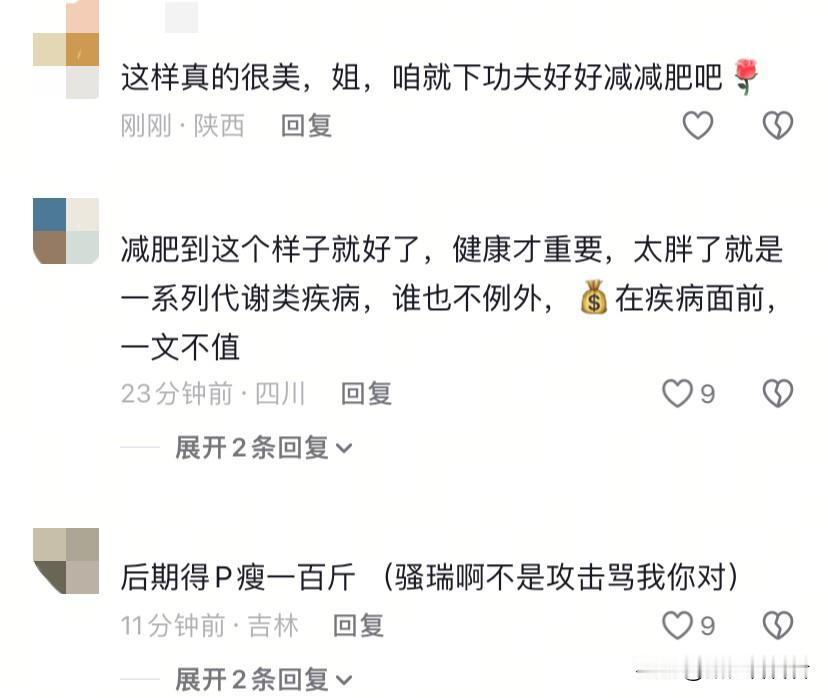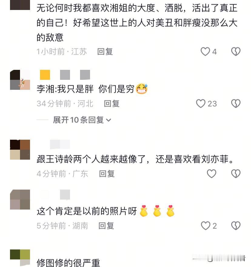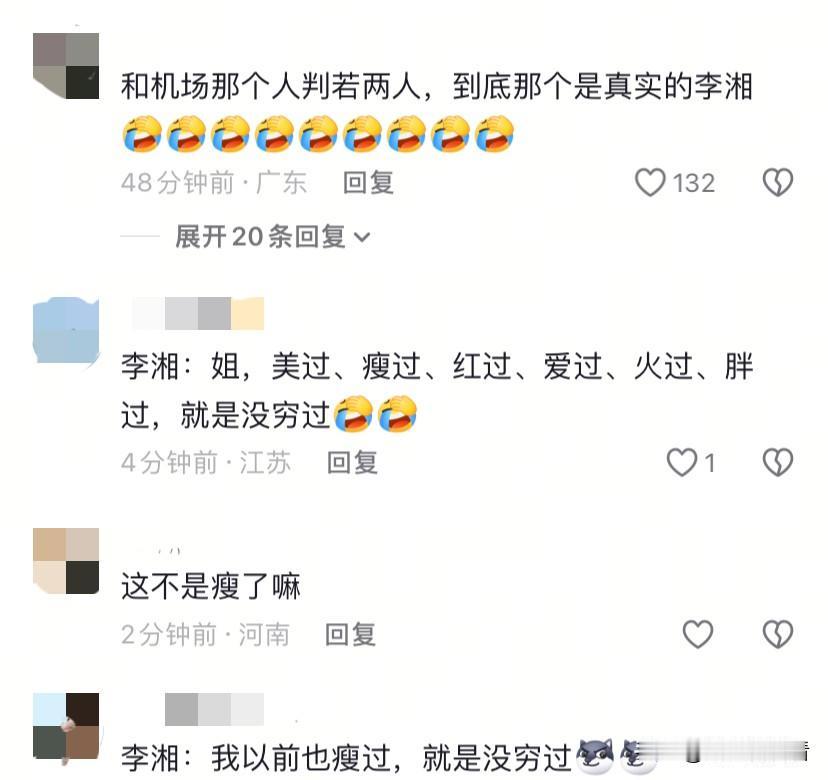 李湘刚晒图一小时,就有将近八百条评论,基本都是在劝她减肥还有讨论她胖瘦的,有人说,她瘦的这么快?有人问,她用的什么P图软件?还有晒出前段时间机场的照片,跟这个天壤之别。 从这张照片上看,确实很美,没有赘肉,没有瑕疵,很漂亮,气质可以赶上年轻的时候了,只是不知道是不是以前的照片还是最近新出的大片,总之看着赏心悦目。 之所以评论区有那么多的人喊话李湘减肥,变美回来,是因为她瘦了真的很美。还有人认为人家美过,火过,瘦过,胖过,就是没穷过。如果她要下定决心减肥那也是有很多方法可以做到的,只是看她现在也不工作了,不用去讨好谁,这个年龄该有必要吗?