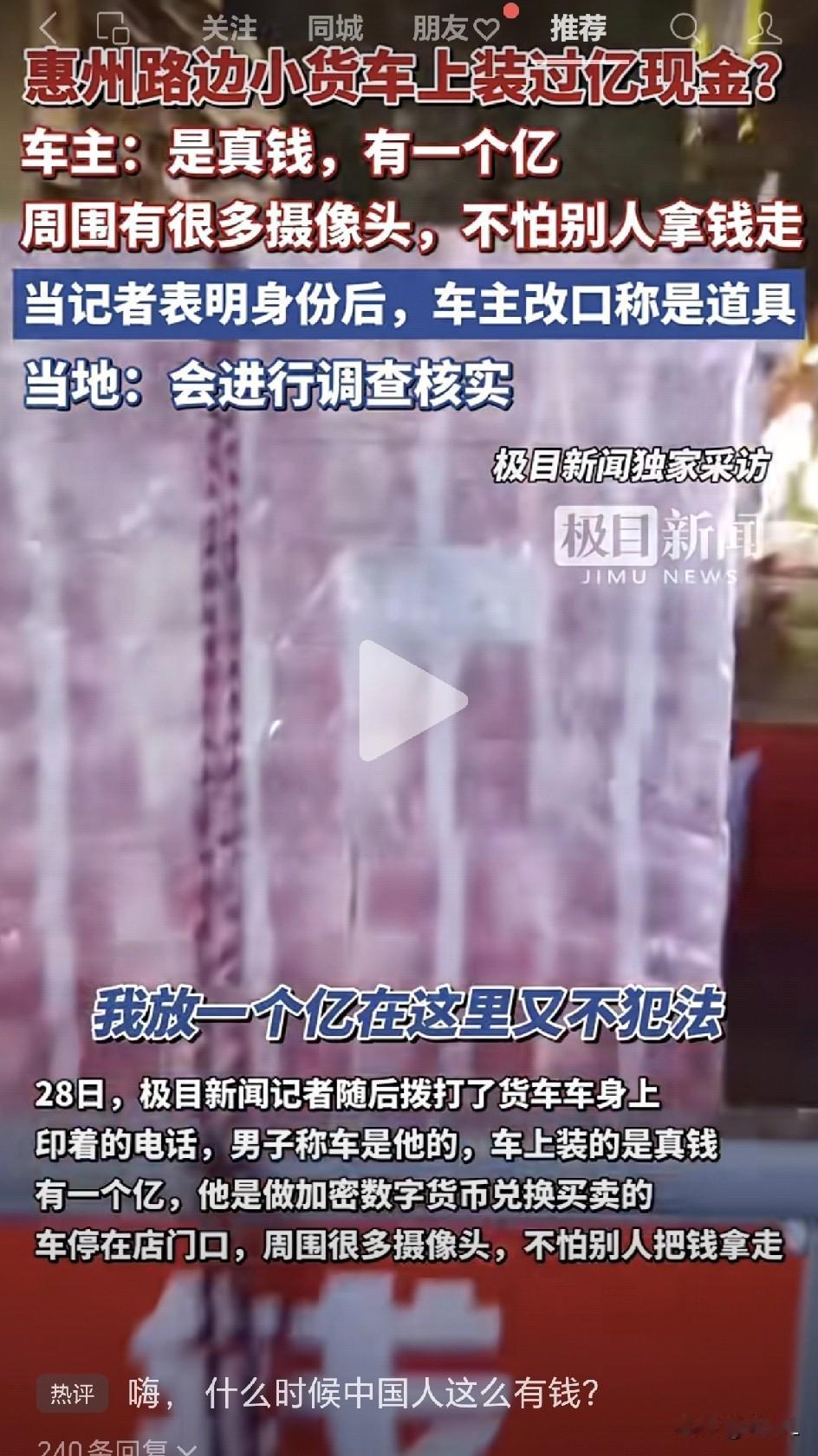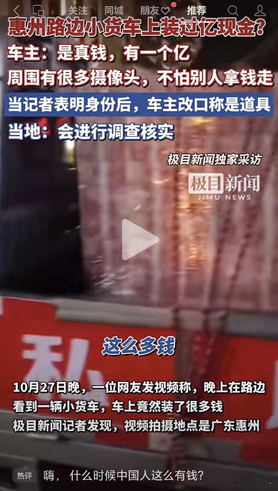 “一亿私房钱”惊现街头!车主嚣张回应:真的,不怕偷!媒体、官方纷纷下场后,剧情瞬间反转! 10月27日,广东惠州,有网友发视频称,晚上路边的一辆小货车上,装了很多钱,而车身上“私房钱”三个大字那是相当的晃眼。 当记者向车身上印着的电话求证时,电话对面的男子说,车子是他的,钱也是他的,都是真钱,有一亿元。车子停在店门口,周围有很多的摄像头,压根就不怕有人偷。 男子还表示,有民警找过他,但是他把钱放在车上又不犯法。 比较戏剧性地是,当记者表明了自己的身份以后,男子的口风直接反转,说车上的钱都是道具,是自己引流用的。 目前据初步调查核实,货车上的纸币是练功钞,是店主欲与线下实体店合作,用来引流的道具,车主已提供购买记录证实用途合法。而辖区派出所确认纸币为假钱,事件没有涉及真实现金或违法活动。 这么大一个乌龙事件,也不能怪看到的网友们大惊小怪。 谁家好人家会把一车的钱放到大马路上?明摆着,钱不可能是真的。 就像网友说的,哪家银行会让你随随便便提一亿元现金?还标明一亿元是“私房钱”,看来家里怎么也得趁个几百亿、上千亿的。 这事一看就是搞噱头,是一场精心策划的“流量骗局”。虽然说现在生意不好做,钱不好挣,但有些手段也不能随随便便用。 车主最初给自己营造出一种“我有钱,我任性,还不犯法”的嚣张人设,当记者亮出身份,立马改口,说明车主是知道事情的严重性的。 车主用一车练功钞,给自己打造了一条“低成本,高回报”的性价比极高的“广告”。 他很成功,也很聪明。他没有违法,却游走在法律的边缘,充分利用了规则的模糊地带。 这大概是这个流量时代,流量经济的一个缩影。 部分商家为了吸引眼球绞尽脑汁,甚至不惜制造“大型社会实验”般的乌龙。虽然从法律上可能无可指责,但从社会公序良俗和商业伦理的角度来看,这种手段无疑是短视和浅薄的。 正如网友调侃的,这“私房钱”的含金量,还不如它所带来的流量值钱。这或许就是这个时代一种令人无奈的“幽默”吧。 信息来源于极目新闻、羊城晚报,侵联删!