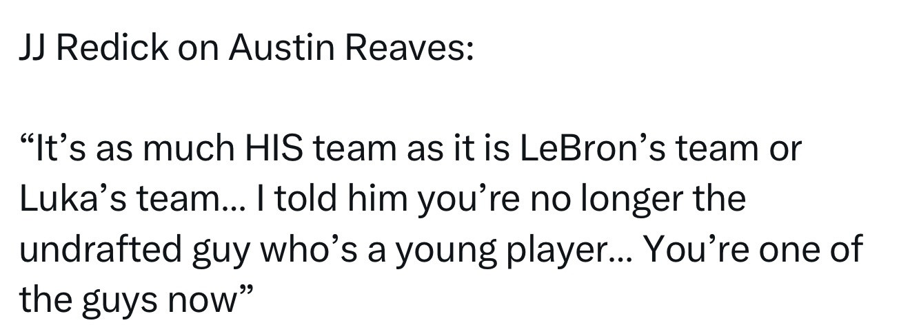雷迪克谈里夫斯:“这支球队既是勒布朗的球队,是卢卡的球队,也同样是‘他的球队’。我曾告诉他,你不再是那个落选的年轻球员了。如今你已是球队的核心之一。”