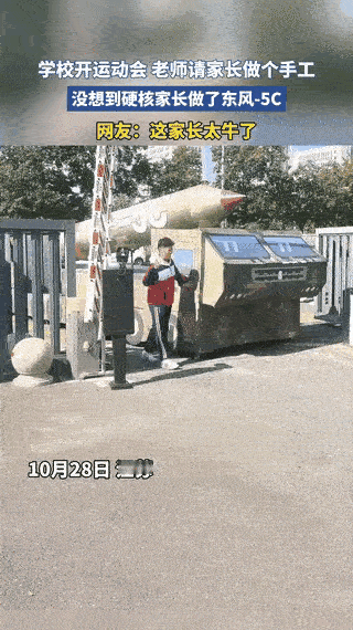 这手工卷得也太离谱了!江苏一学校运动会要家长配合做手工展览,结果有位家长直接手搓了个“东风—5C”模型,连专门的运载车都配全了,孩子推着进校园时,嘴角都快咧到耳根了。 别光说家长牛,这哪是做手工啊?分明是把国防教育揉进了日常里。比起课本上的文字,孩子推着自己家长做的导弹模型,那种对国家力量的自豪感,肯定比听十节课都深刻。 网友调侃“让你做手工,没让你搞军备竞赛”,还有手残党直呼“学不来”,其实大家羡慕的不只是家长的手艺,更是这种把“大主题”做成“小温暖”的巧劲儿。 你小时候做过最让同学惊艳的手工是啥?或者你觉得这种“硬核手工”算不算最生动的启蒙?