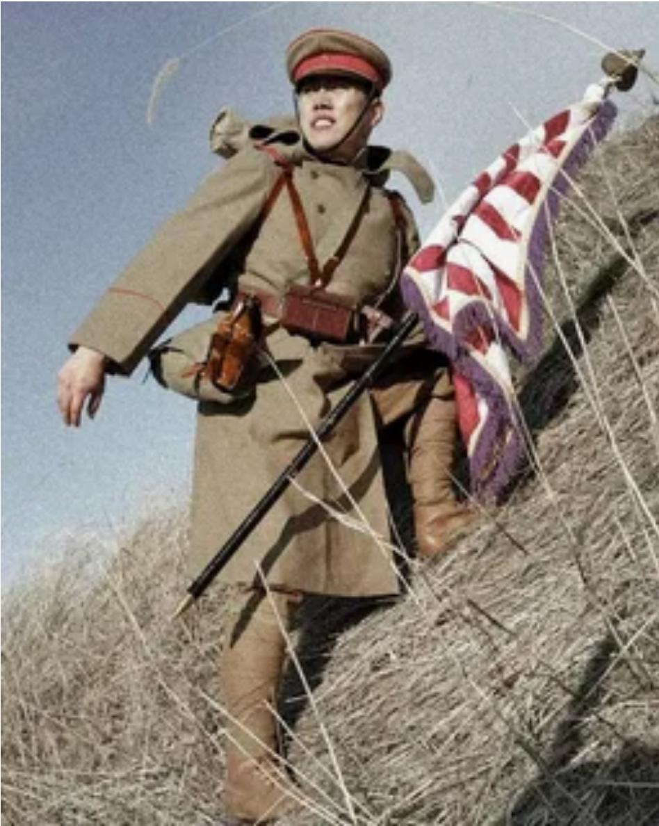 1937年12月13日,南京,光华桥日本官兵在桥上拍照,彰显“武功”。 光华桥位于南京秦淮河上的重要交通枢纽,始建于1930年代,是连接城内外的关键通道,南京保卫战期间成为中日军队激烈争夺的战略要点。 大家注意:画面里出现了日军的代军旗,其实就是军旗周围的那一圈紫色的流苏(参见图2~3)。真正的军旗平时不打开,放在一个绸布套里。如果战况不利,日军会指派专人将其烧毁,免得落入敌手,损害“皇军”威严。 所以,抗战打了十四年,咱们连一面军旗也没缴获到(注:是真正的军旗,不是日之丸旗或者日章旗)。
