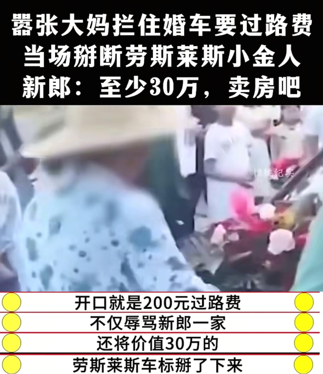 大妈哭诉,没人能懂她。为啥呢?因为她拦婚车要钱,给糖给烟都不行,没 200 块钱不干,一边辱骂新人,一边拍打劳斯莱斯车盖,还把小金人给掰下来了。劳斯莱斯的小金人哦,修复需要 30 万。新郎把大妈告了,那劳斯莱斯是婚庆公司的,新郎也赔不起这 30 万。大妈一把鼻涕一把泪地到网上哭诉,希望大家支持她不用赔钱。你觉得该不该赔呢? 大妈怒砸车 大妈怒砸小伙车 大妈怒砸人车
