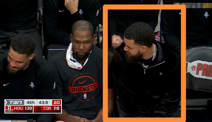 火箭当家后卫范弗里特真是太崇拜杜兰特了!在今天火箭客场挑战猛龙的比赛中,发生了特别有趣的一幕。当时双方的比赛进行到了第四节的最后时刻,火箭领先对手21分。 此时转播镜头给到了火箭的替补席,只见此役因伤缺阵的范弗里特直勾勾的看着身旁的杜兰特,眼神里充满了崇拜,可是杜兰特却摆出一副高冷的样子,两者形成了鲜明的对比。