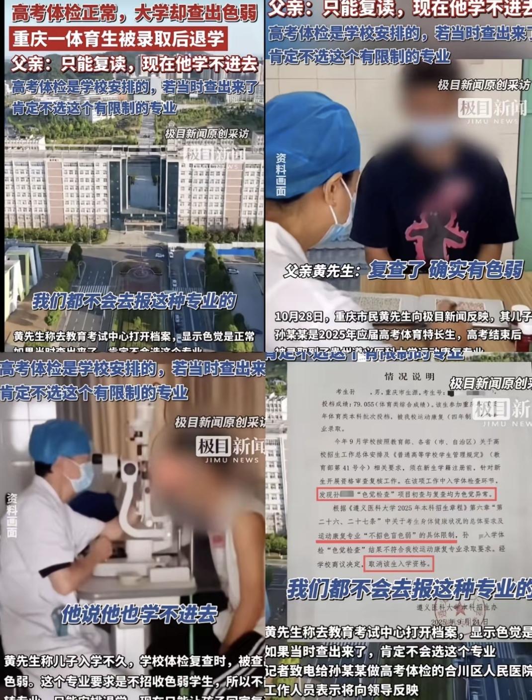2023年秋季,重庆一名体育生高考考了502分,顺利被贵州遵义医科大学运动康复专业录取。入学后却被校方告知因色弱需退学,家长不服:高中体检一切正常,连转专业的机会都不给? 校方回应称招生简章早就写明不招色盲色弱,体育生也不能例外。家长质疑高中体检走过场,连十分钟都没花。网友炸锅:为啥不提前说清楚?高中体检是不是糊弄人? 有人爆料色弱问题早该自知,也有人说这事全推给学生太没人性。现在这学生只能复读重考,五年练体育的工夫全打水漂。这事到底谁该负责?没人说得清。