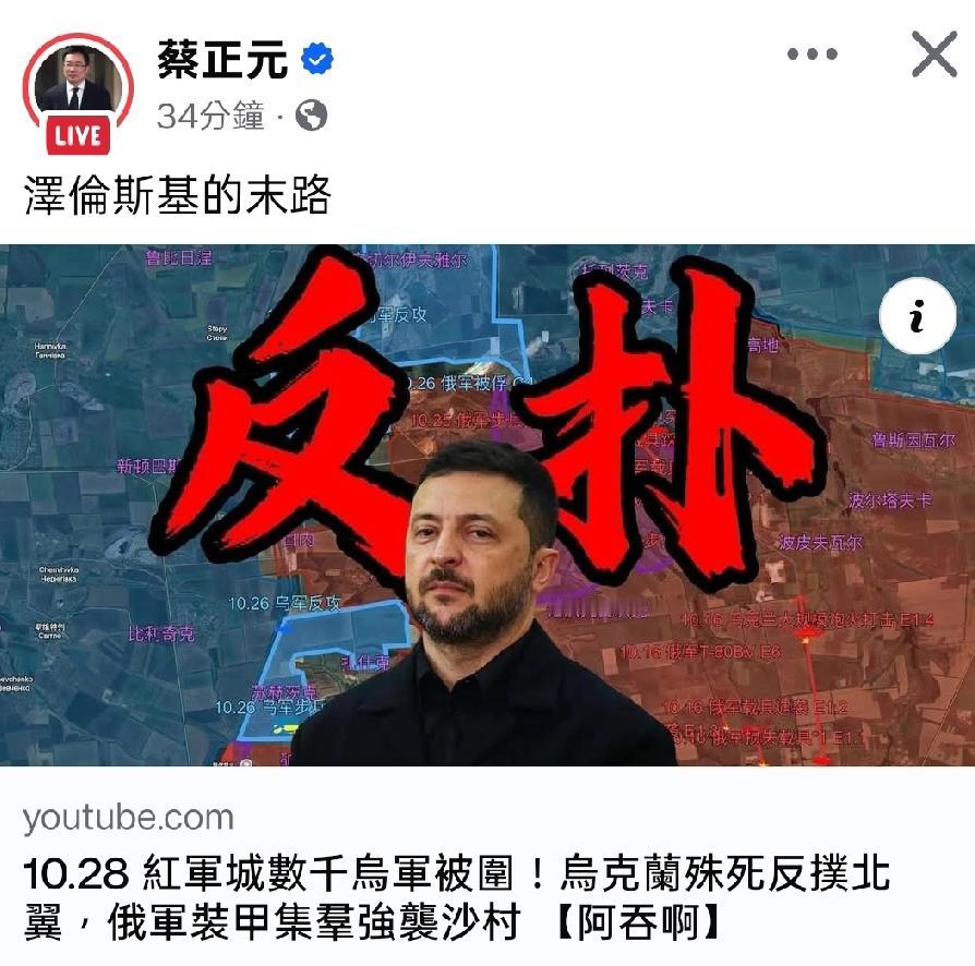 蔡正元教授直播讨论泽连斯基的末路,红军城有数千军士兵被围,对上俄罗斯装甲群,乌克兰的反扑看来短小无力。 下面网友一水的留言,纷纷表示 泽连斯基的今日就是犬养清德的明日 没有了黄毛的助力,泽连斯基带领的乌克兰还有机会吗? 泽连斯基发布会