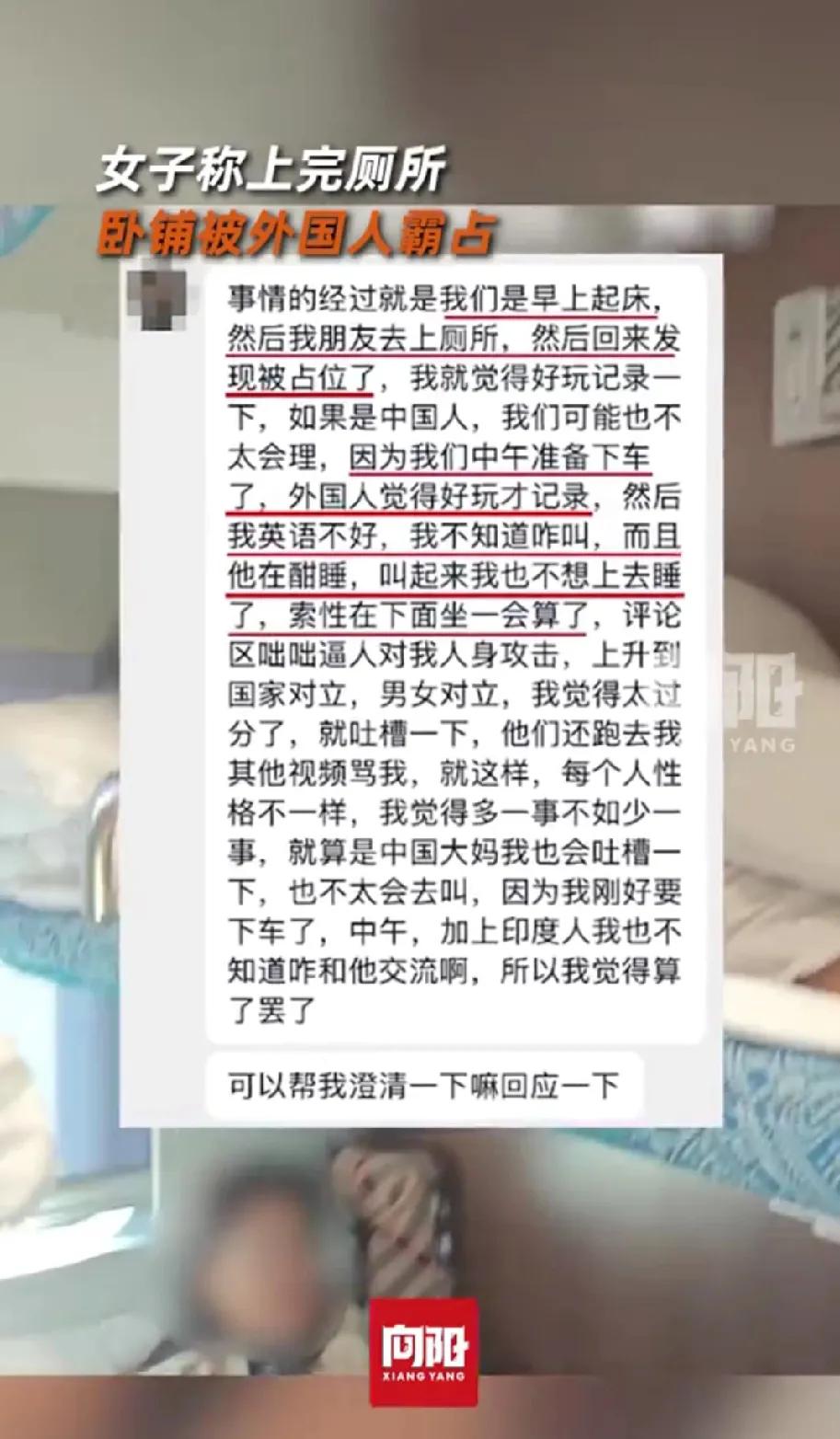 一女子称上完厕所卧铺被外国人霸占 本该同情她,合法权益被占,但是她跟谁也不说,只是自己默默拍了视频发网上。网上有人为她打抱不平,她却说只是吐槽。 谁知你是吐槽还是炫耀?英语不会,有手机翻译软件。乘务员,乘警都可以找啊。只要思想不滑坡,办法总比困难多。但自己抱着多一事不如少一事,将就了。这时候,就体现中国是礼仪之邦了? 当然,当事人都说将就了,我做为旁观者,我表示尊重。 也希望该女子,面对国人的时候,也能如此豁达宽容!