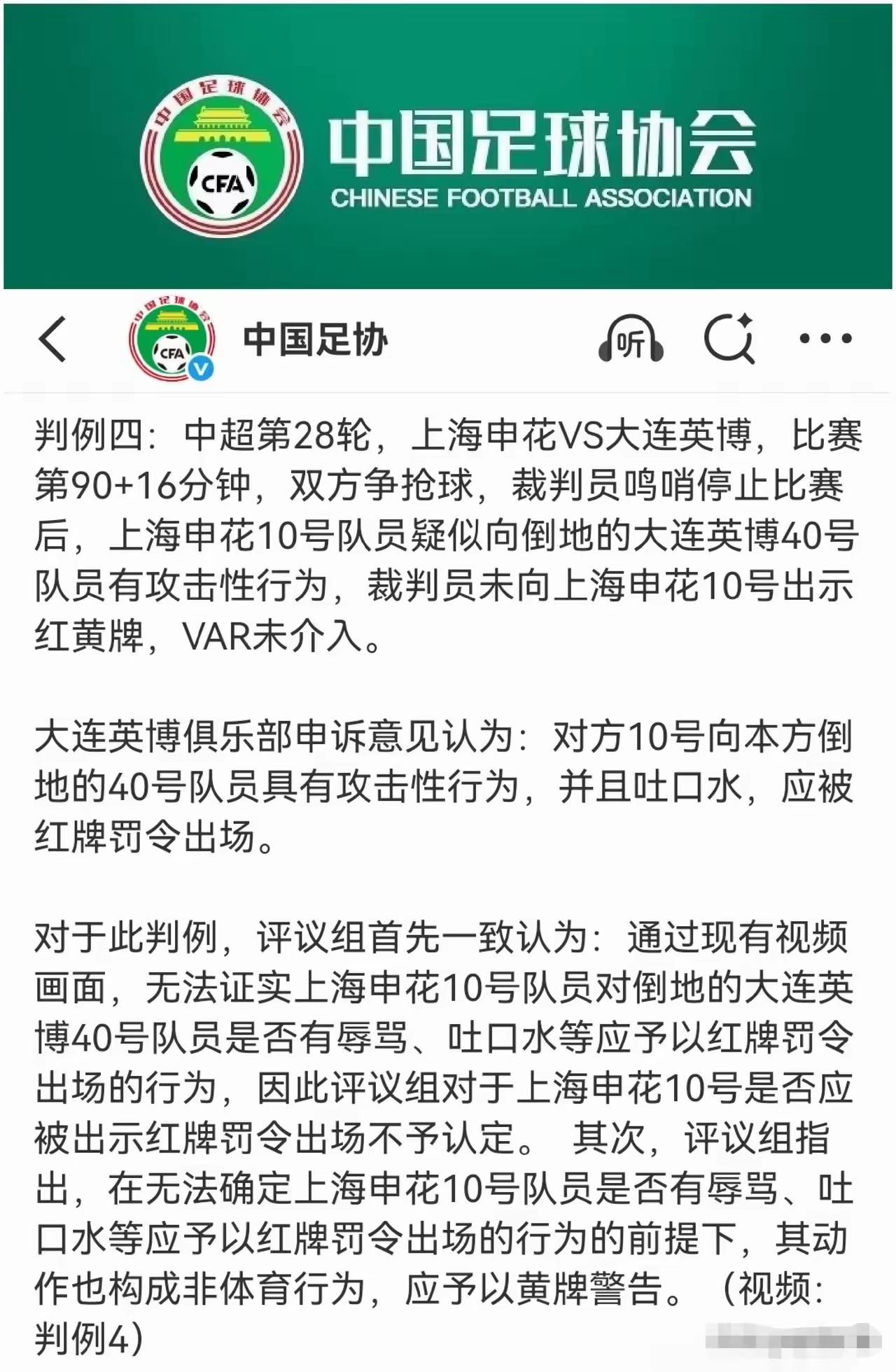 力保上海申花夺冠?足协已经连脸面也不顾了? 昨晚足协公布最新一期裁判评议,上轮上海申花2-2战平大连英博的比赛中,特谢拉对倒地不起的廖锦涛吐口水,导致双方差点打起来。赛后大连英博提出申诉,结果足协评议组以视频模糊,看不清特谢拉是否吐口水为由,拒绝追罚特谢拉。 其实这个结果球迷们早就猜到了,申花老总谷某人担任中足联副理事长,直接管理裁判。裁判们帮着上海申花一点毛病都没有,毕竟裁判也要保住自己的饭碗。 本赛季申花已经多次靠裁判获利,“保花杯”已经很明显了,现在到了最紧要关头,裁判们也不遮遮掩掩了,直接暴露出了力保上海申花夺冠的企图,不管能不能最终得逞,他们必须要再努力一把,这样才能对谷总有所交代。 上海海港和成都蓉城认命吧,本赛季冠军不可能拿到了,谁让你们的关系没人家的硬呢。中超 上海申花 上海海港 成都蓉城 大连英博