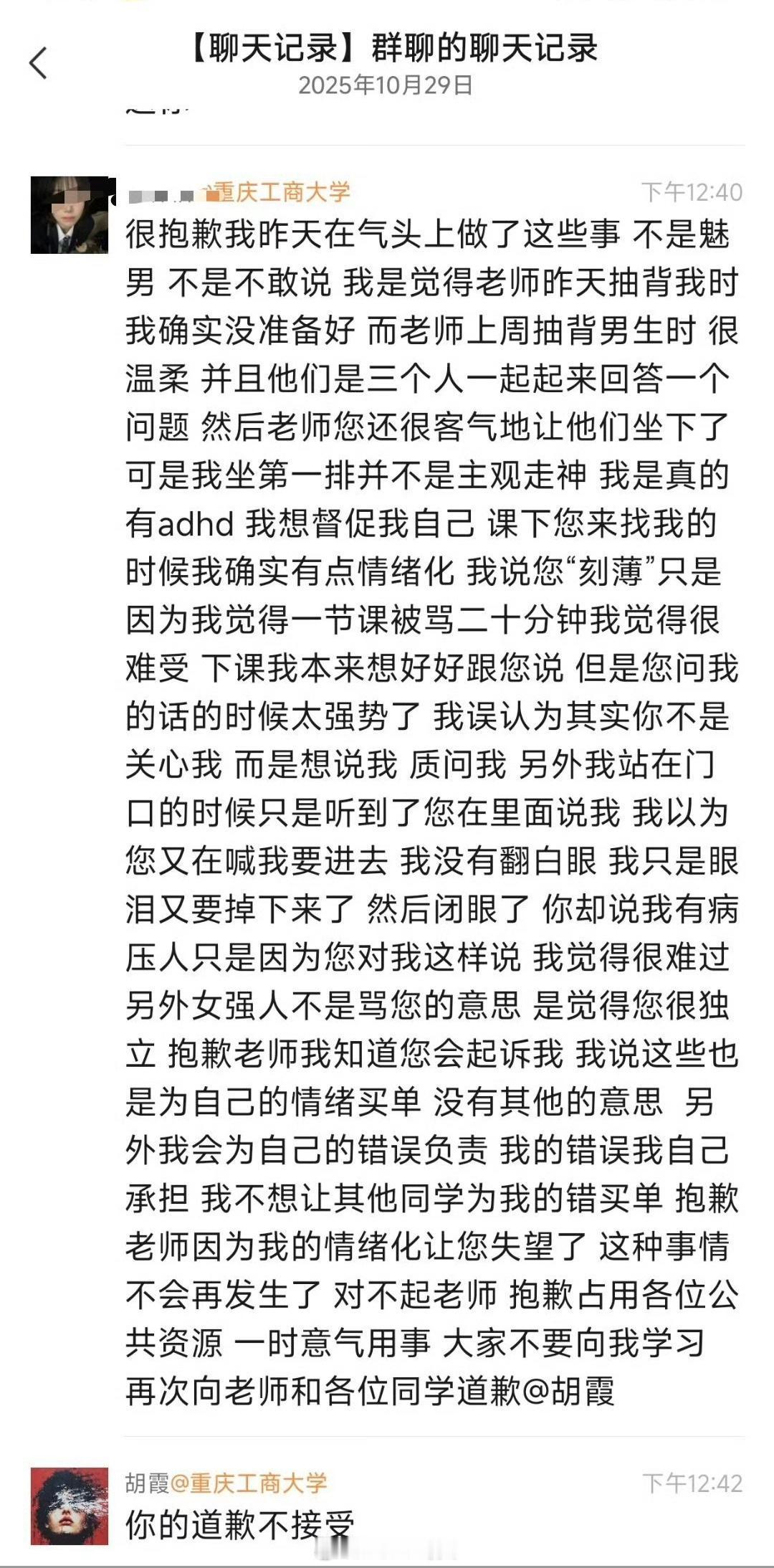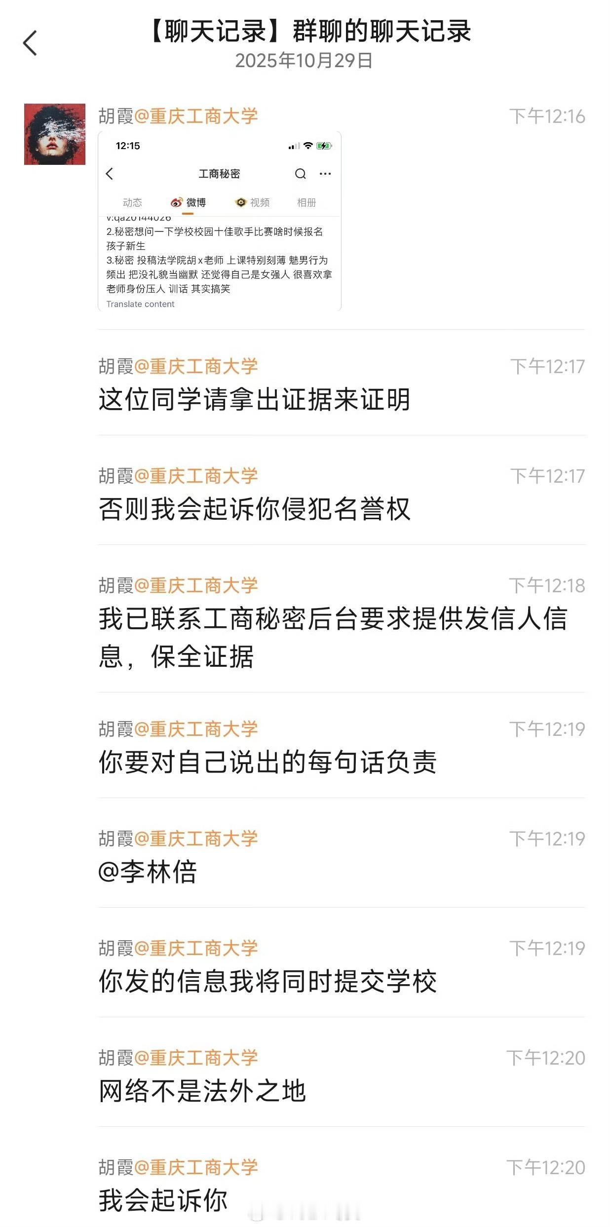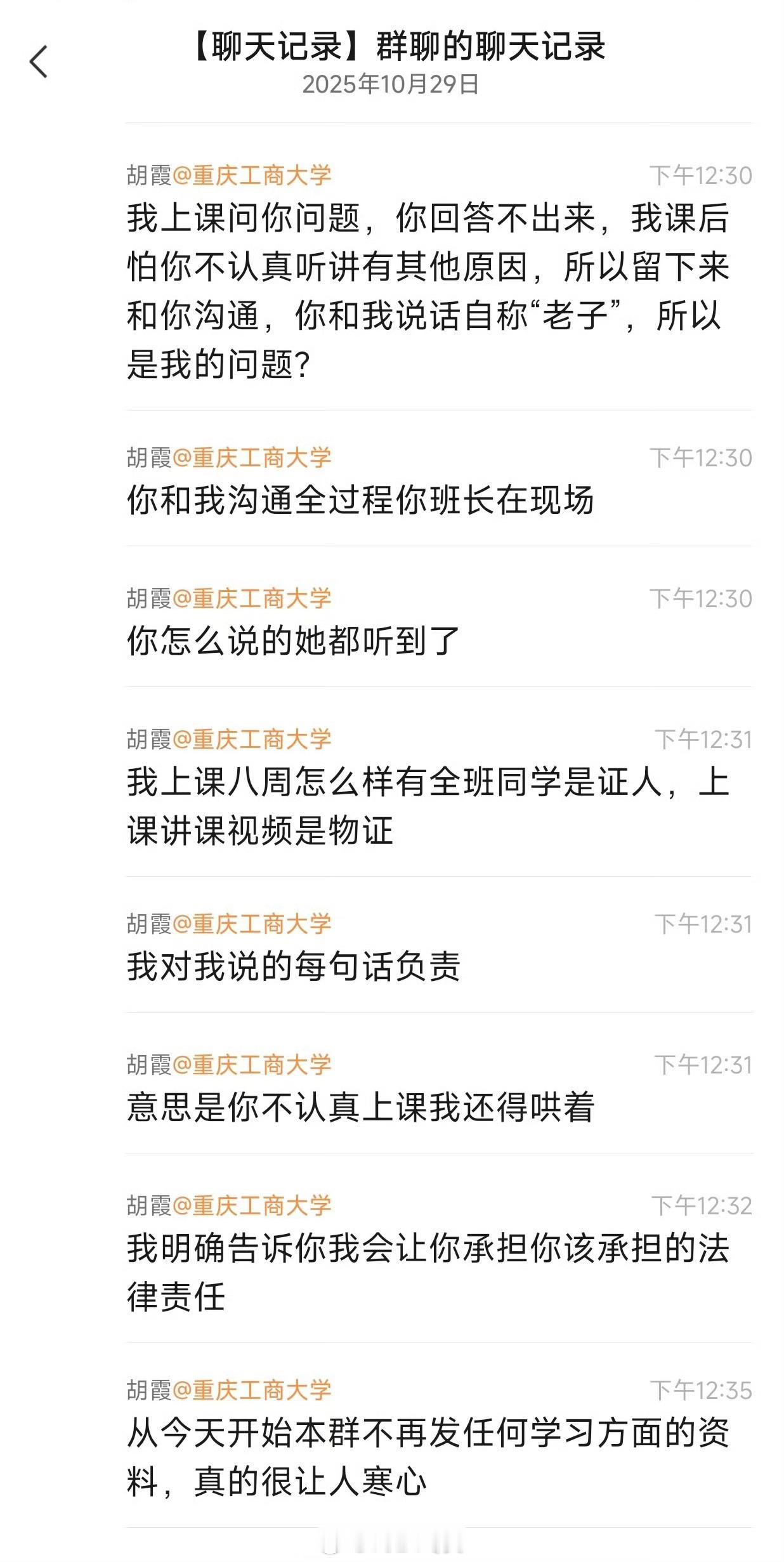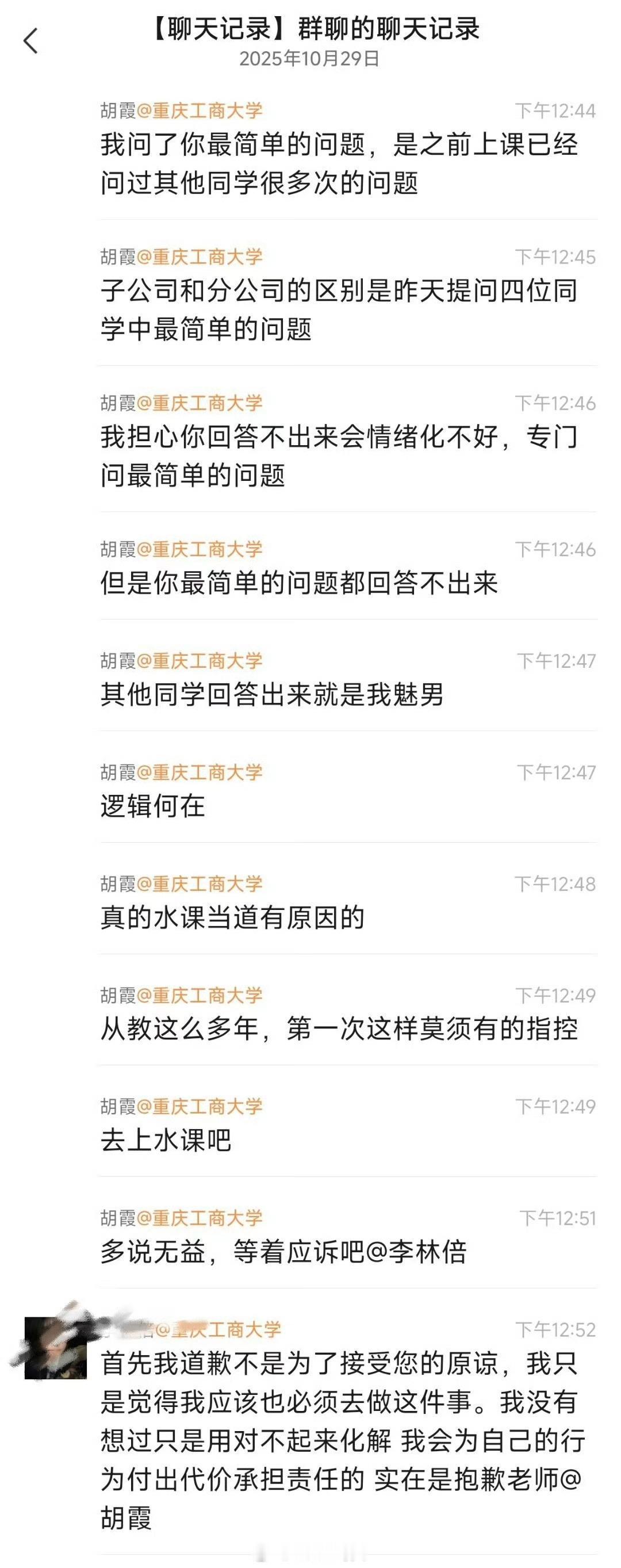 重庆工商大学李某蓓同学微薄上诽谤老师,被老师起诉了。朋友圈污言秽语,和老师说话也是开口就是老子,这竟然是大个大学生,虽然不是什么好大学,但是素质真的堪忧。上课不认真听讲,被老师点名回答问题,连最基本的概念都不会,因此觉得老师搞针对。老师遭投诉 老师泼水事件 老师辟谣