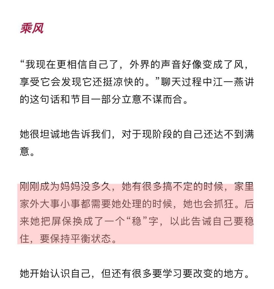 江一燕当了妈妈后要处理好多事江一燕当妈后把屏保换成了稳字 2022年官宣得女,在今日播出的节目中官宣离婚。江一燕曾在《传闻中的她》中说当了妈妈之后家里的大事小事都需要她来处理,她会有抓狂的时刻,后来她把手机屏保壁纸换成了一个“稳”字,提醒自己要稳住。谈及未来,她曾说要养好身体,80岁的时候和女儿一起去旅行。