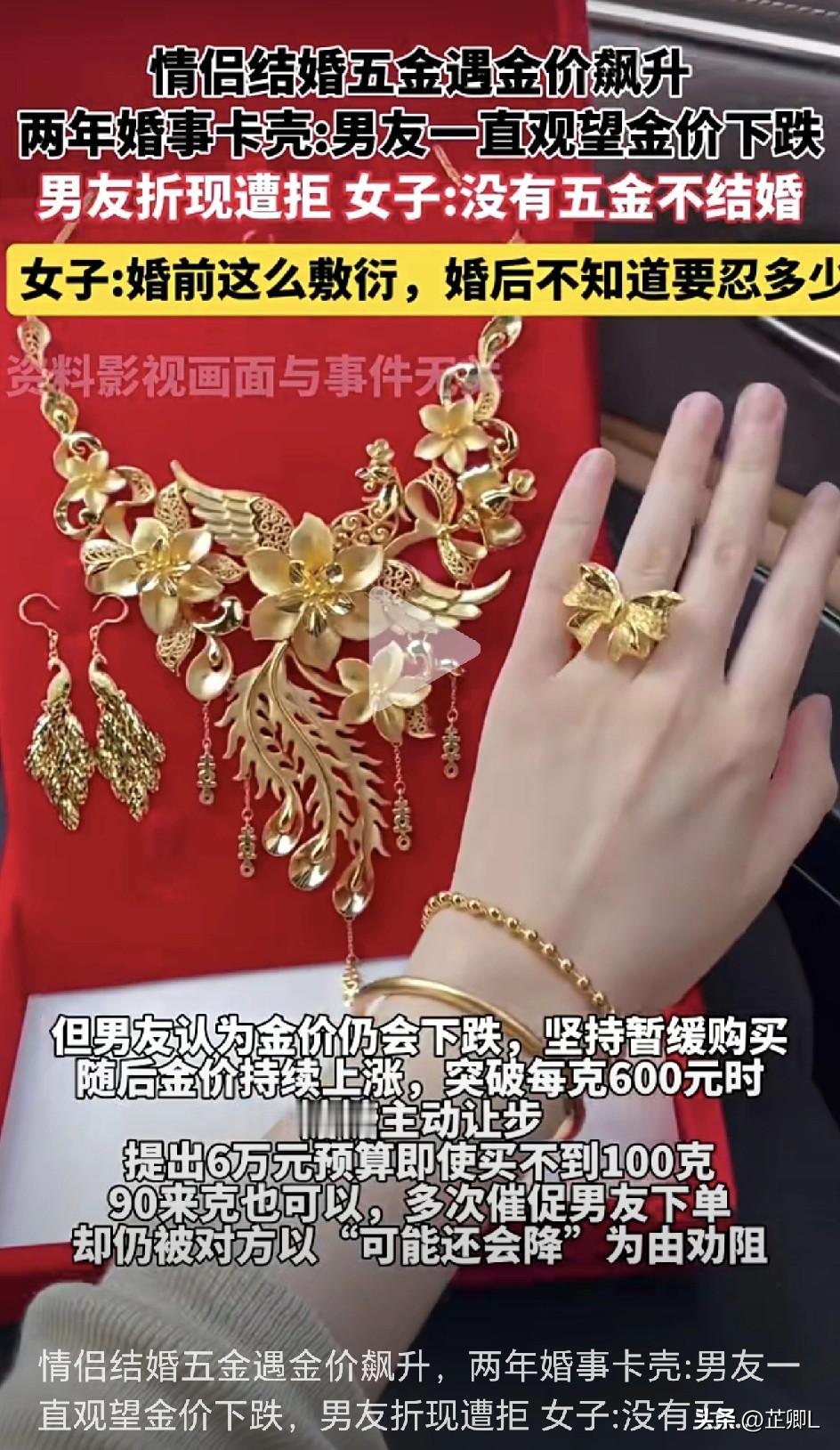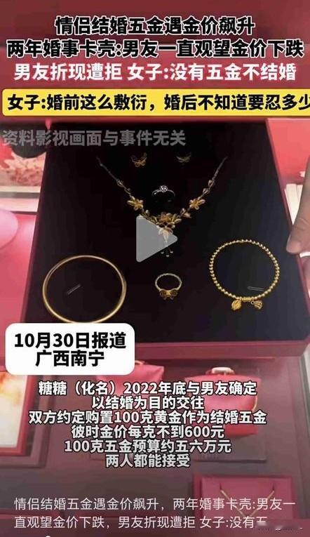 “没有五金,这婚不结了!”6万预算因金价飞涨卡死婚期,嫁人还是嫁金?评论区炸了。 结婚买金饰,好像成了标配。从开始听说的三金,到五金,再到七金、九金,好像现在的婚姻无金饰不结婚。 因为买金饰导致矛盾重重,甚至分道扬镳的也绝非个例。 广西南宁的糖糖就是其中一个。 糖糖与男友于2022年底确定了婚约,双方约定了结婚将购买100克黄金,作为结婚五金首饰。 当时金价不到600,整体价格大概5、6万,双方都觉着是可以接受的价格。 只是男友觉着金价还会下降,所以坚持要再等一等再买。 当金价突破了600元时,糖糖主动做出了让步,6万买不了100克金饰,买90+克黄金也可以。 但男友坚持金价一定会下跌,让糖糖再等等。 没想到这一等,到了2025年端午节后,直接等到了金价突破900元大关。 这时候双方家长已经敲定了婚期,但因为购置五金成本翻倍,彻底谈不拢了。 糖糖明确拒绝男友将6万预算折现的建议,坚持“没有五金不结婚”。 糖糖表示,她并非执着于黄金本身,而是男友迟疑不决、精打细算的态度让她心寒。认为男友现在对婚事就这么敷衍,担心婚后可能会面临更多问题。 两年的婚事彻底卡壳! 评论区的网友也是议论纷纷,分成了两个阵营: “我发小结婚金价太高就折现的...这不是很正常吗?” “支持,主要是态度问题。” “嫁人还是嫁金?” “他不给你买,你可以给他买啊。” “才6万块钱都舍不得,以后还会舍得什么?” “直接分了就得了,还谈啥感情,视频发出来不就是道德压制?” “不会互相体谅的婚姻也过不好的,这婚结不结也没啥。” “有能力就买不要像那个结婚跳河的新郎一样人财两空。” “趁还没结婚,散了吧。” 糖糖与男友的分歧,理性来讲,很难说谁对谁错。 男友想让金饰价值最大化,原本没有错,只是错在错误的估量了金价的走势,没有想到金价像插上翅膀一样,一路飙升。 对糖糖而言,问题核心并非黄金克重,而是男友一而再再而三的拖延所体现出的 “精打细算”和“迟疑不决” 。让她质疑的是,对方履行承诺的诚意和步入婚姻的决心。 他们共同的问题在于金价初涨时,未能就“等待的风险”进行有效沟通并设定底线,导致期望值严重错位。 “糖糖的五金”已经超越其本身,成为一个象征性的考题。 当最初的共同计划遭遇现实变数,我们是选择共同面对、灵活调整,还是固执己见、让感情为差价买单? 这场关于黄金的争执,最终让两人看清了彼此在婚姻观念上最根本的差异。 构建婚姻的基石,究竟是可量化的物质,还是彼此间的信任、担当与共情能力? 不过是个人选择不同,而已! 信息来源于热度新闻,侵联删! 带定位晒今日生活 我的今日状态:😁轻松愉快 我这里的天气:🌧下雨