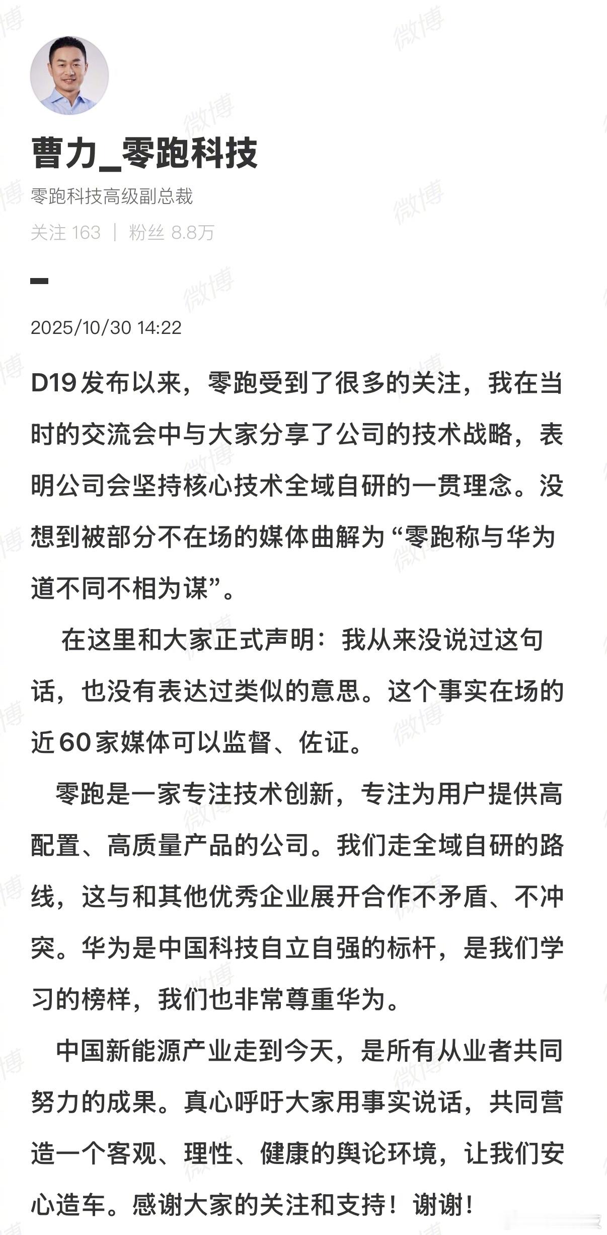 零跑辟谣:从来没说过「零跑与华为道不同不相为谋」这句话,也没有表达过类似意思。