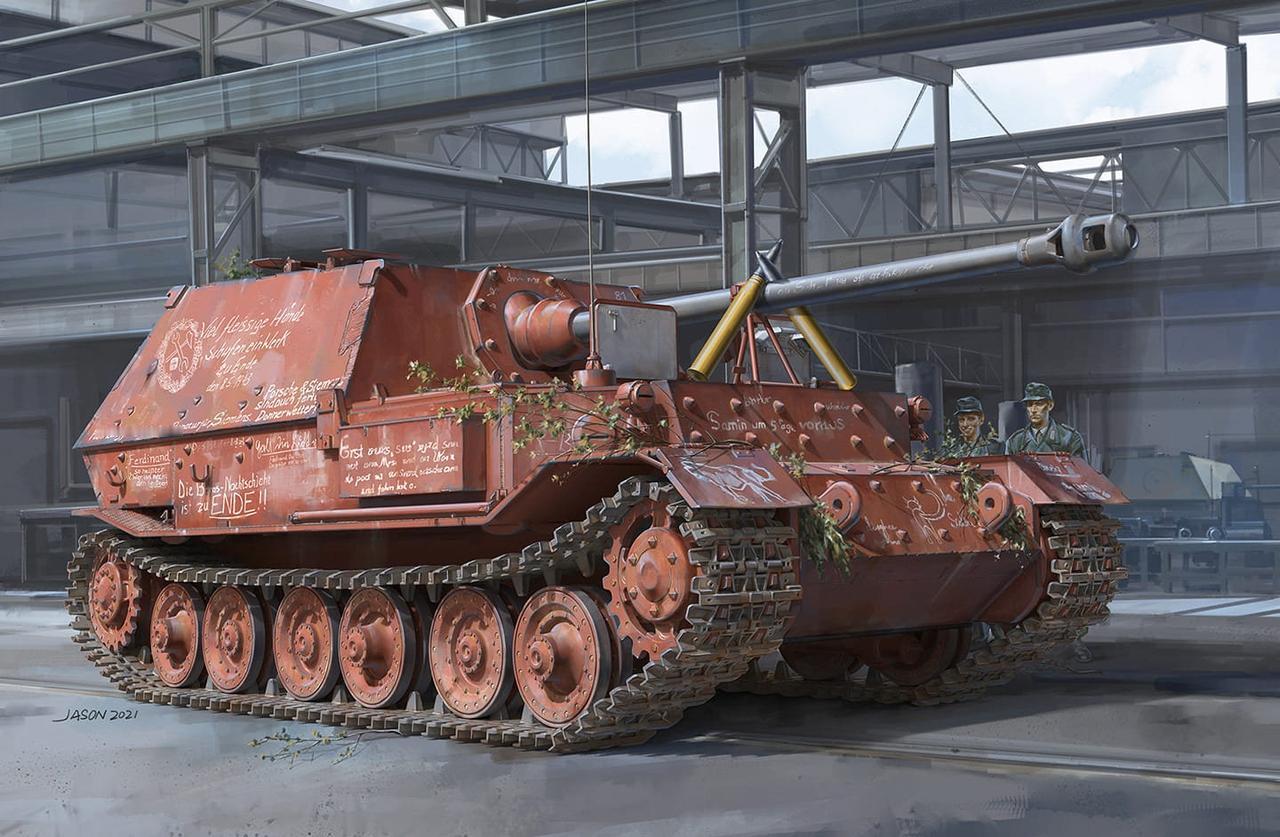 1943年5月8日,奥地利,圣瓦伦滕,保时捷公司尼伯龙根工厂。最后一辆“斐迪南”坦克歼击车下线,其底盘编号为150100。该车尚未安装火炮防盾,车体也未涂面漆,仅喷涂了红丹底漆。 “斐迪南”坦克歼击车(Sd.Kfz. 184)是德国保时捷公司设计的重型坦克歼击车,装备71倍径88毫米反坦克炮,正面装甲厚达200毫米,1943年库尔斯克战役中首次投入实战。 尼伯龙根工厂位于奥地利圣瓦伦滕的装甲车辆制造厂,1942-1944年间专门生产"斐迪南"及其改进型"象"式坦克歼击车 红丹底漆是以四氧化三铅为主要成分的防锈底漆,呈橙红色(参见涂2),德军装甲车辆在总装后需先喷涂底漆,再施以标准暗黄色面漆。