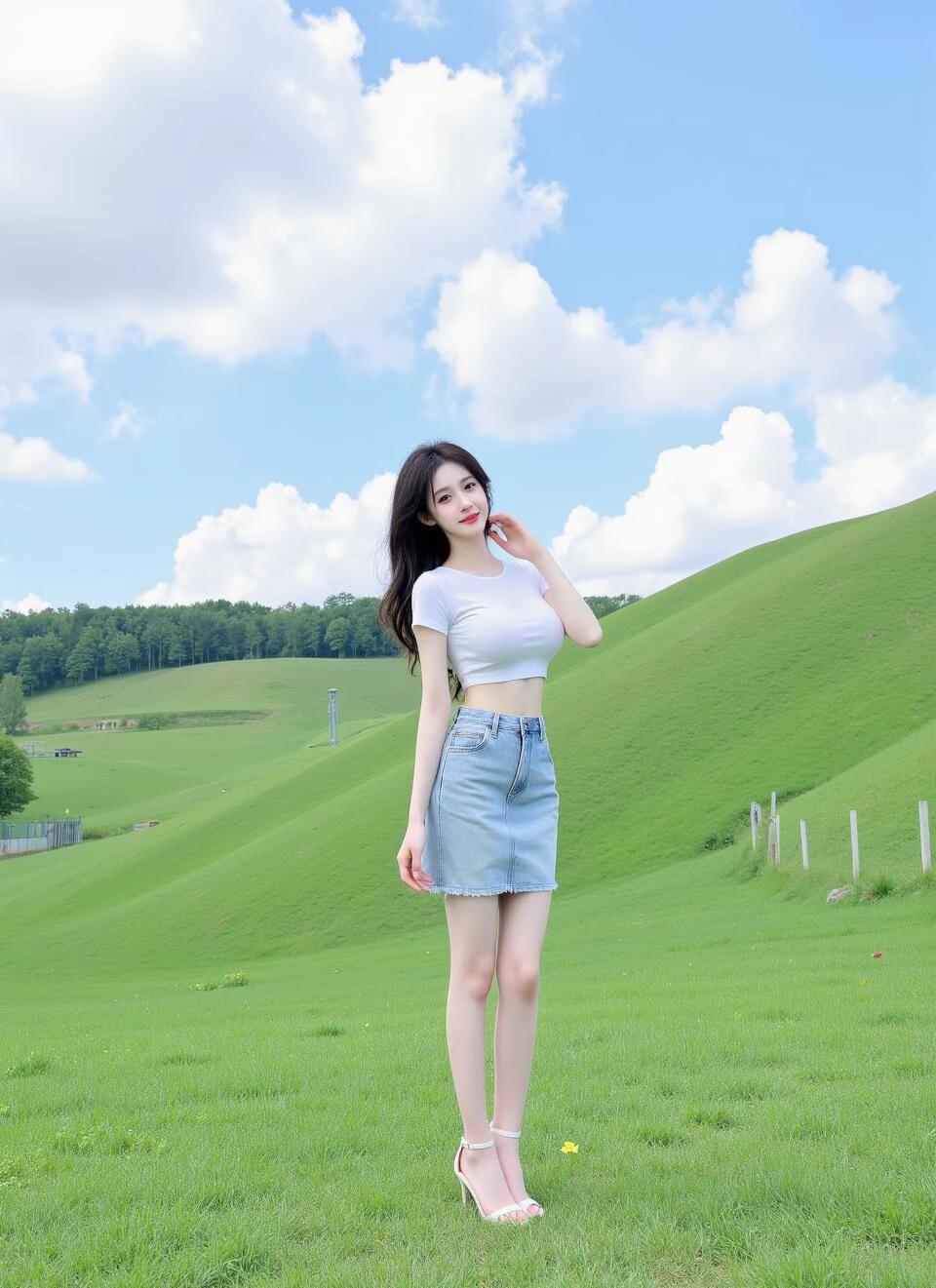 夏日清新穿搭,绿意盎然的山野间,少女漫步在青草地上,背着一个白色小包,轻松自在。