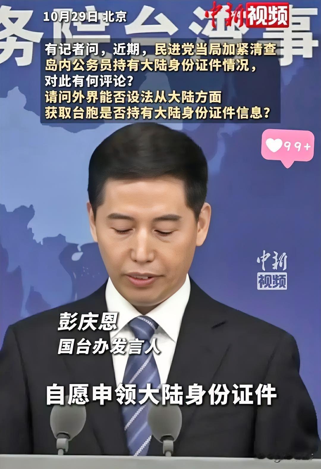 快报!快报! 最新消息! 国台办发言人彭庆恩明确表态:台胞自愿申领大陆身份证件是合法权利,个人信息绝不会泄露! 两年前起,大陆就为台胞送上便民“大礼包”——台胞证、居住证双保障!在大陆生活、上学、找工作,无需多跑多办,“一证通用”超省心。 可民进党当局偏要逆流而行,2024年就开始对相关台胞搞清查,2025年5月还把清查范围扩大到公务人员及其家属。这种操作被痛批是制造“绿色恐怖”,一边威胁同胞、侵犯隐私,一边刻意制造对立、撕裂族群、煽动仇恨,对两岸发展和民生进步没有半分益处,早已遭到台湾本地居民强烈反对。 大陆以诚相待,为台胞提供便捷证件和保障;民进党却以怨报德,用政治操弄伤害同胞感情。民心所向从不由分裂势力左右,这种倒行逆施只会让更多人看清其真面目。 你觉得民进党这番操作能阻止两岸同胞走近吗?评论区说说你的观点。台胞福利 台胞双证 台胞办 台胞政策 台胞小问答 台胞服务手册 台胞證