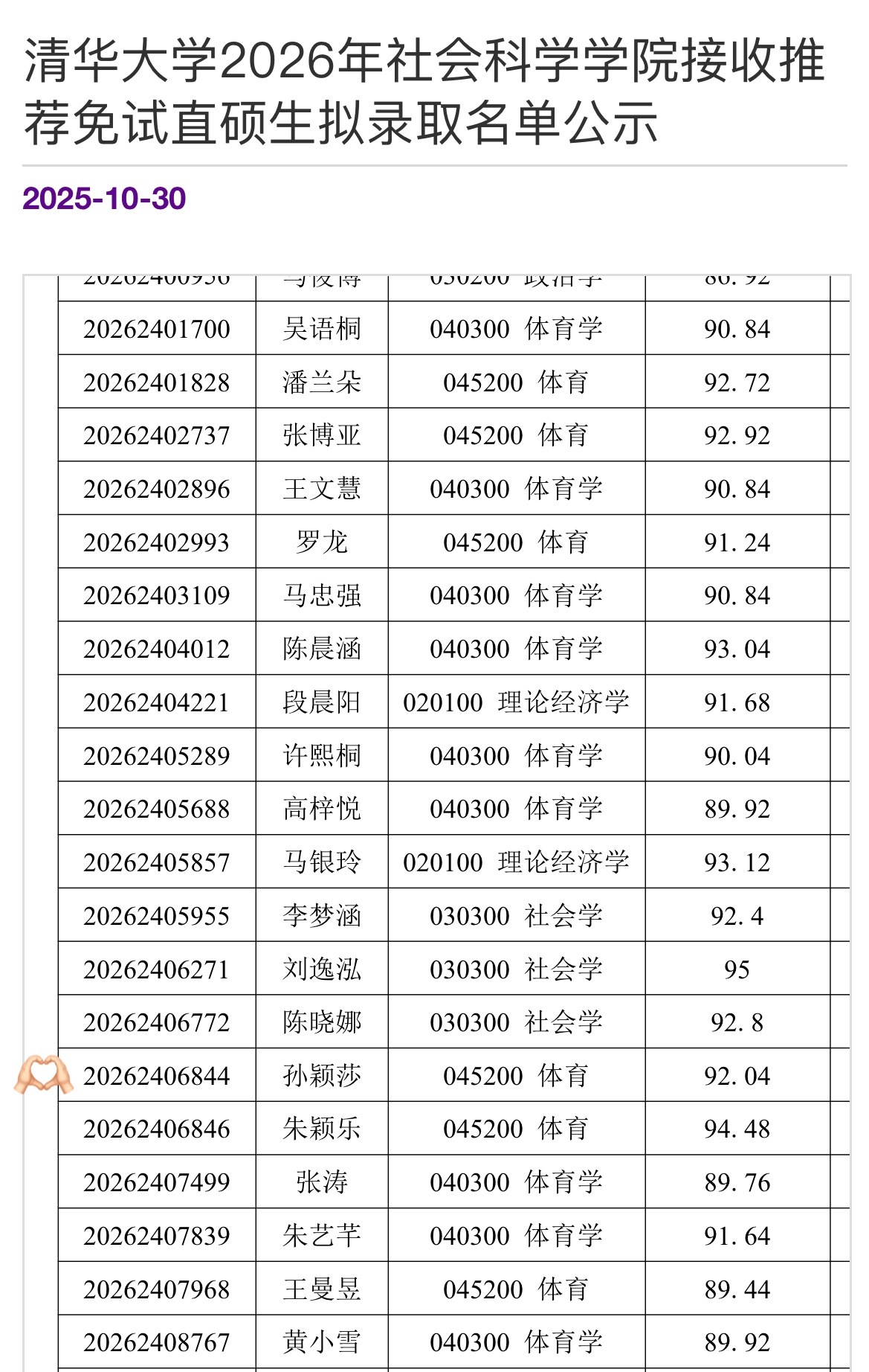 清华26年社科免试直硕生拟录取名单公示孙颖莎 宝宝好棒👏🏻👏🏻