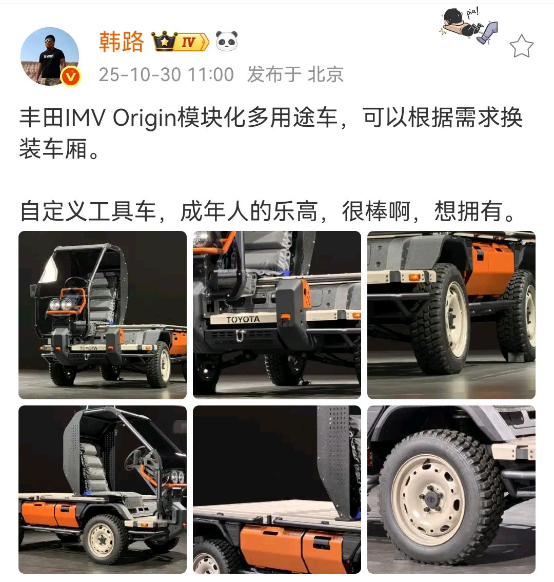 韩路:丰田IMV Origin模块化多用途车,可以根据需求换装车厢! 目前最大的问题就是这款车能不能合法上路? 根据现在的法规来看肯定是不可以的,因为它的任务模块是可以灵活替换的,不符合现在对于商用车的定义。如果这是在厂区内部使用的车辆,那肯定就允许了。 想法很好,最重要的还是价格,毕竟对于大多数工作不需要更换那么多任务模块。