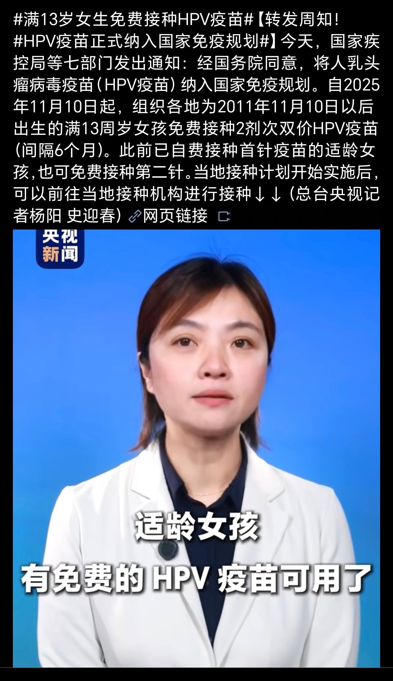 满13岁女生免费接种HPV疫苗这个必须给个大拇哥!!!